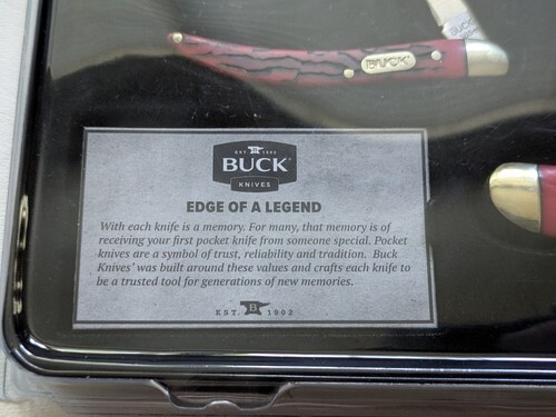 This set of Buck Knives includes the 382 Trapper and 385 Toothpick pocket knives, both with red Delrin handles and made from 3Cr13 steel. The knives are manual and have lockback mechanisms, with the Trapper having two blades at 2.25" and 2.75", and the Toothpick having one plain edge blade. The set comes in a collector tin and is a great addition to any knife collection. These original Buck Knives were made in China in 2021 and are perfect for collectors or anyone in need of a reliable and stylish pocket knife.
