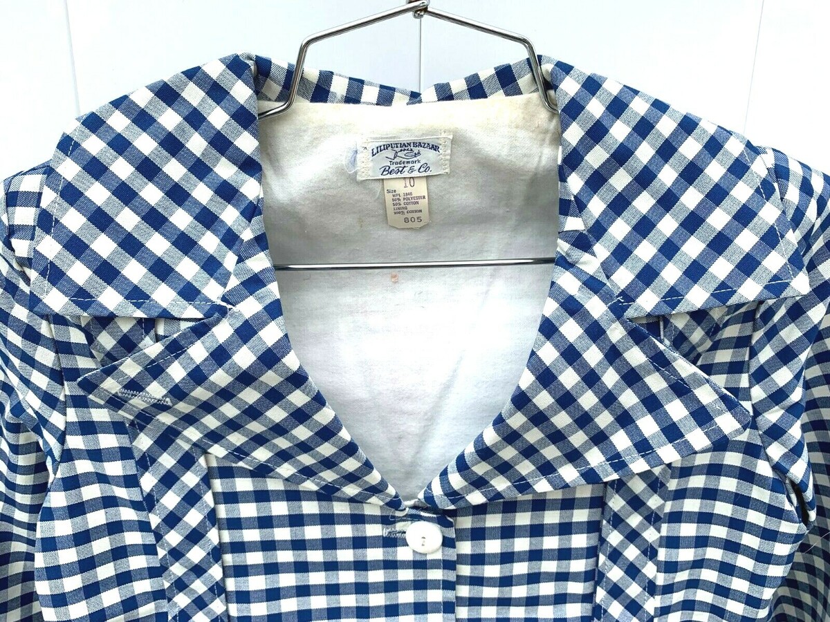 Adorable vintage 1970s Liliputian Bazaar by Best Co. girls? coat in blue-and-white gingham. Crafted from a cotton/poly blend with a full cotton lining, this piece is new without tags ? a rare survivor from the era. Features a straight silhouette, long sleeves, and classic gingham pattern that?s both timeless and collectible.
