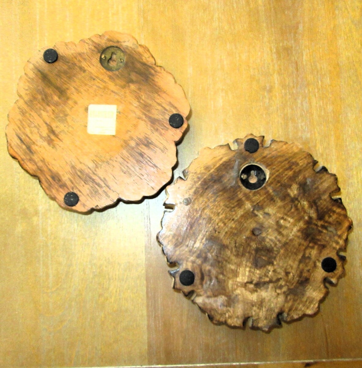 These are hand carved and detailed designs with wood burned highlights to the medallions. These are made of solid wood with metal hangers on the back. Measures 8? x 8? square x 3? thick. Excellent vintage condition. Set of two. Price listed if total for both.