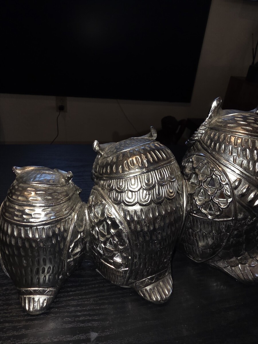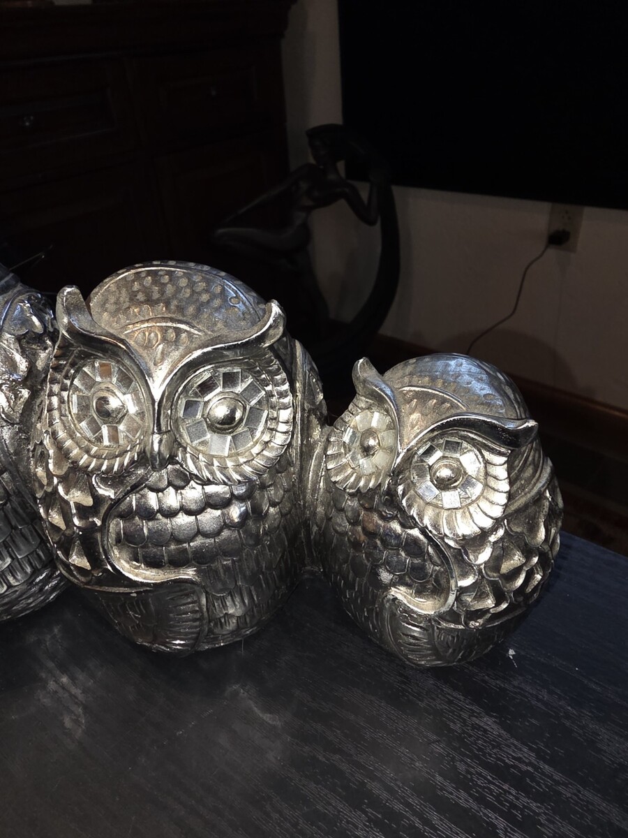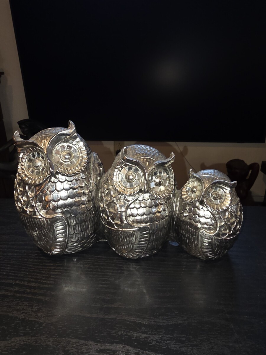 Set of 3 Silver Chrome Owl Ceramic Figurines Statues Home Decor Wise Owl Family