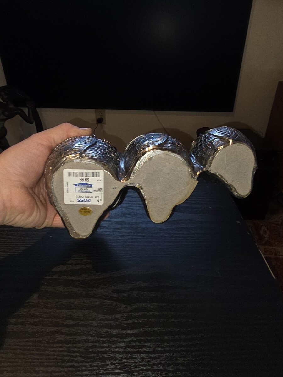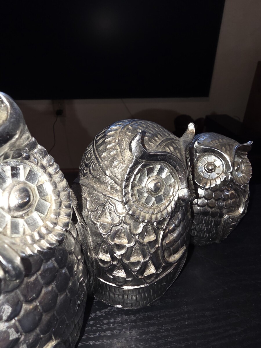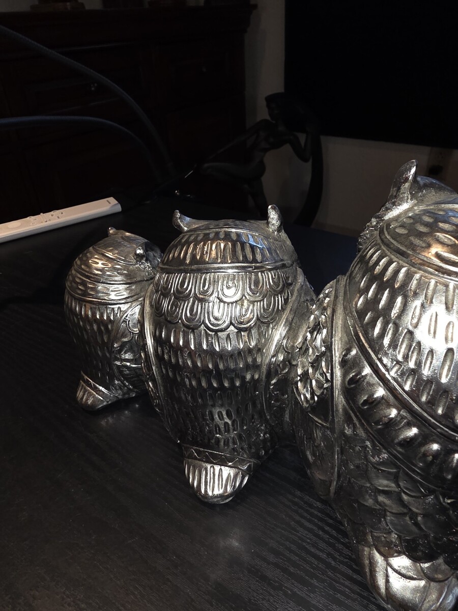 Set of 3 Silver Chrome Owl Ceramic Figurines Statues Home Decor Wise Owl Family