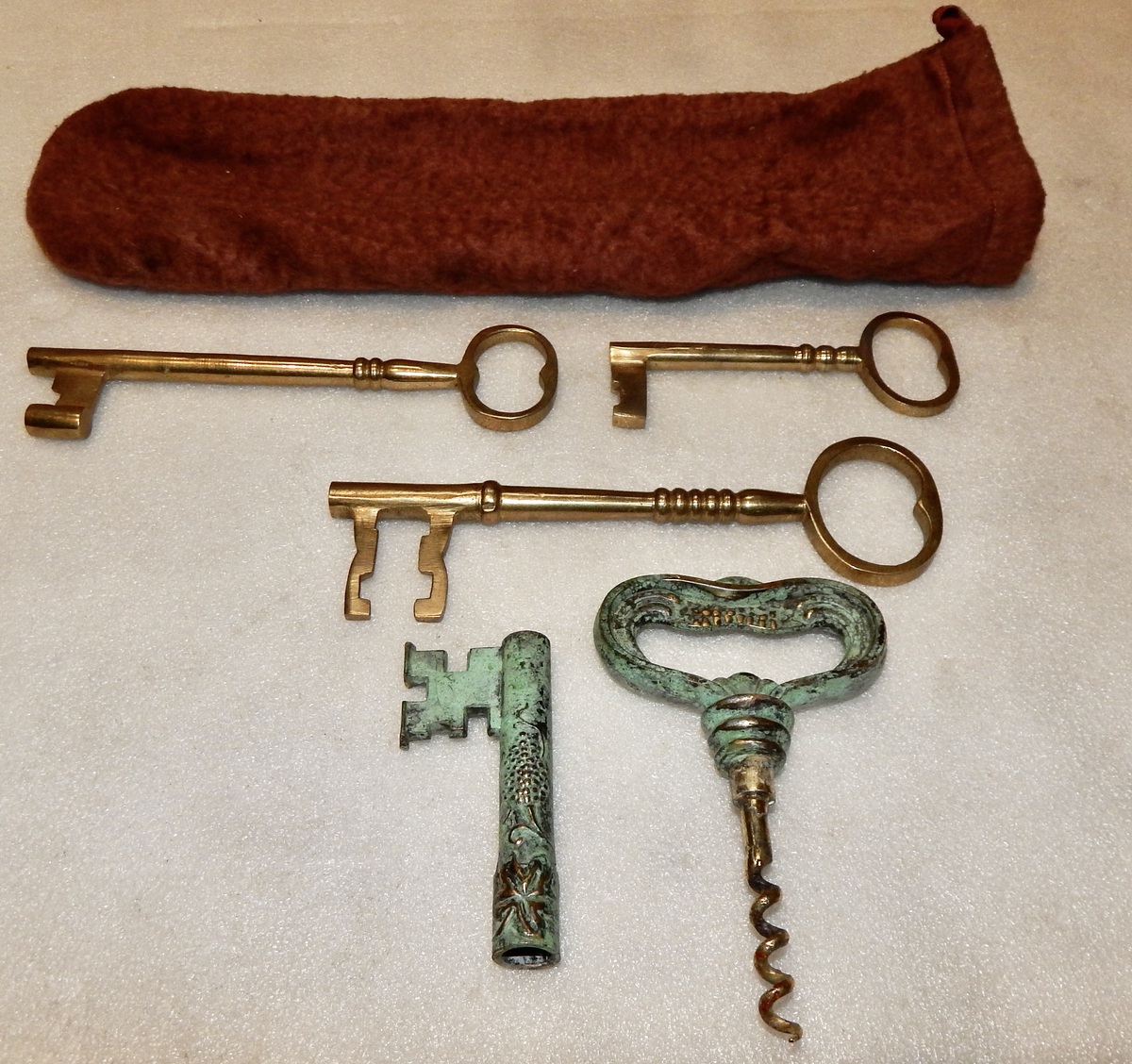 Vintage Brass Skeleton Keys Lot Of 4 Various Sizes & Bag Wine Cork Screw 10R