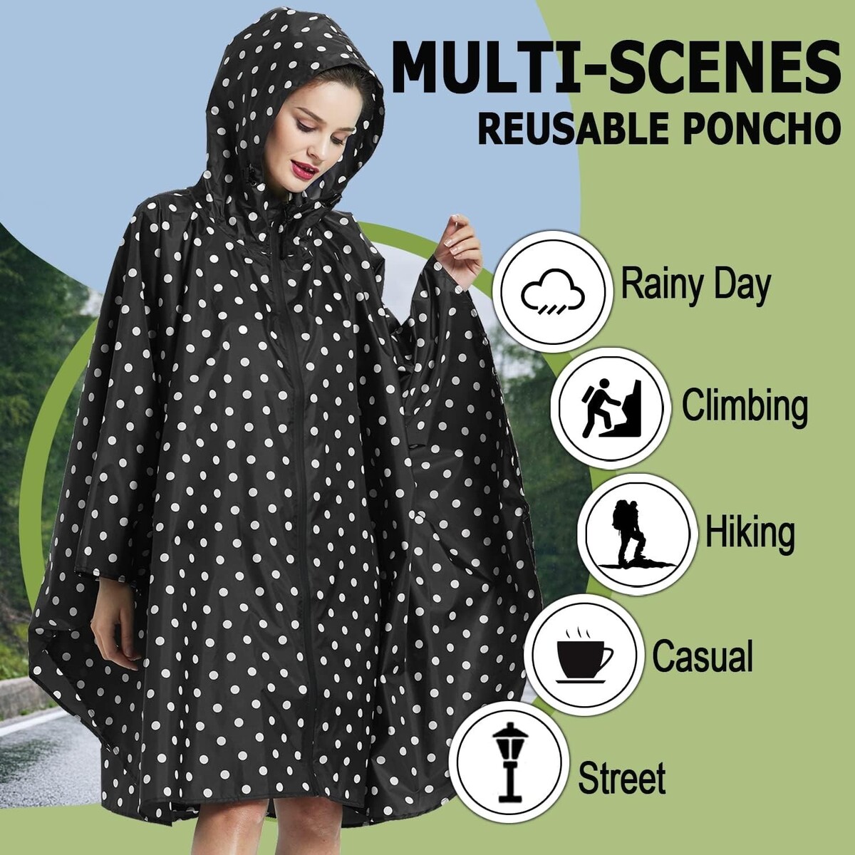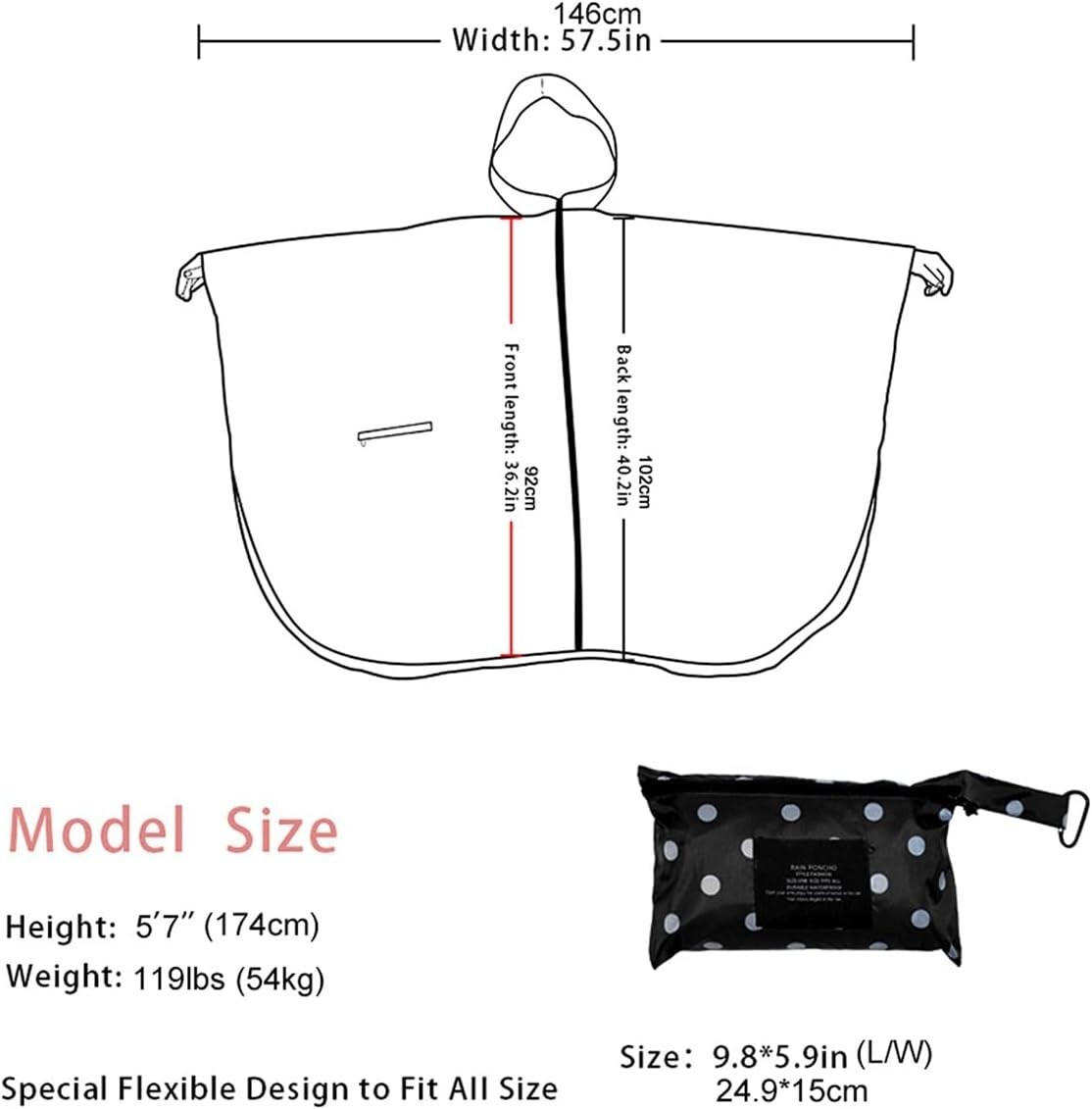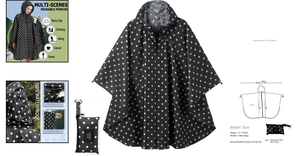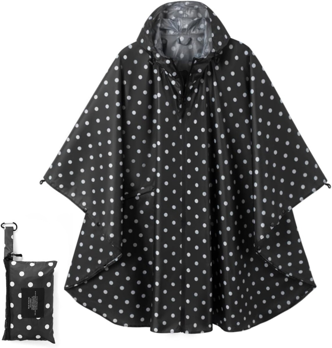 One Size Design: This stylish includes a wide-brimmed hood with drawstrings, ensuring full-body protection. The front zipper and four snap buttons on each sleeve offer secure fastening, while the spacious front pocket keeps your essentials dry.