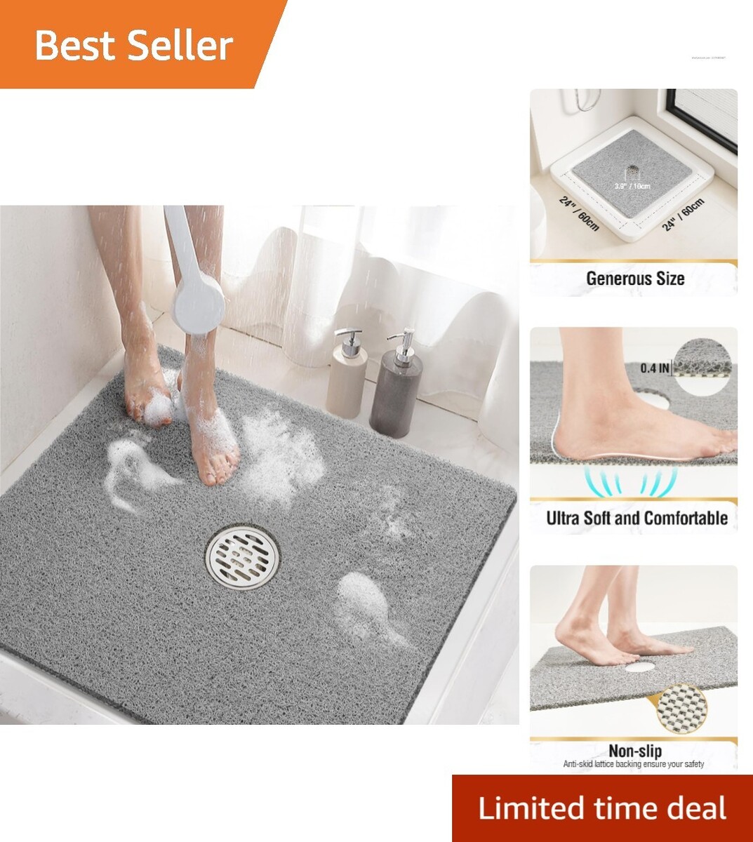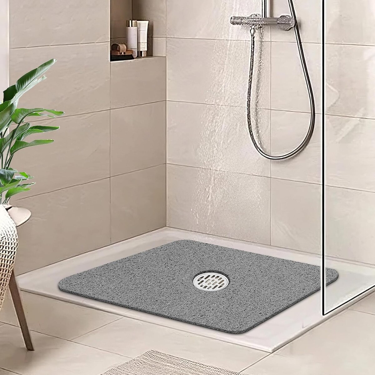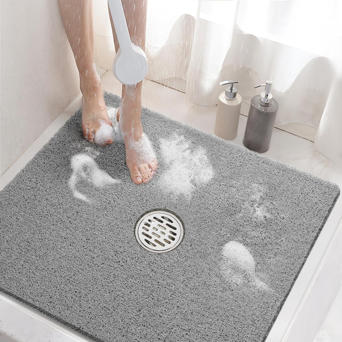 Family-Friendly 24x24 Non-Slip Shower Mat - Soft PVC, Phthalate-Free in Grey