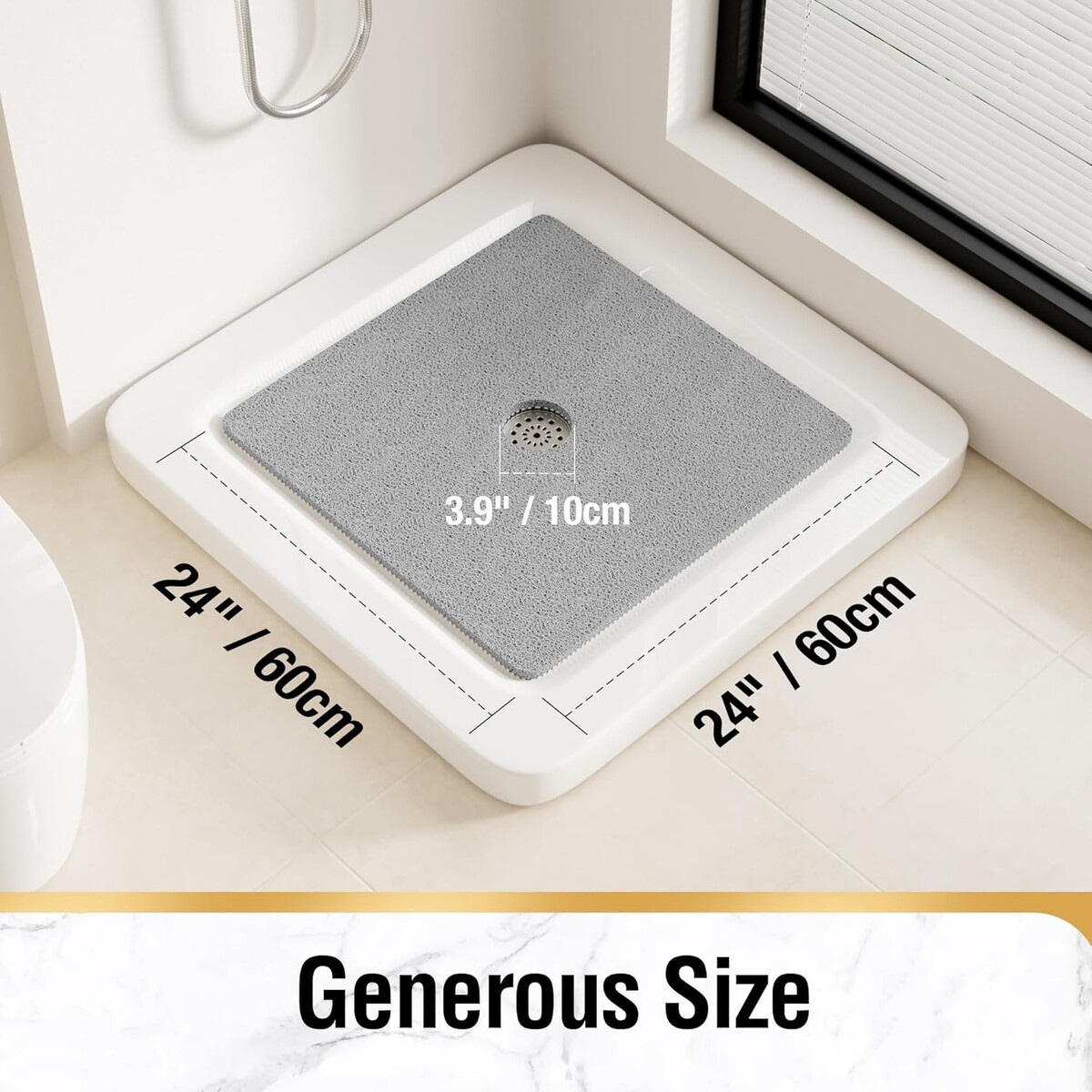 Trimmable to fit any corner of your home, initially 24 x 24 inches, ensuring suitability for most bathtubs and floors.