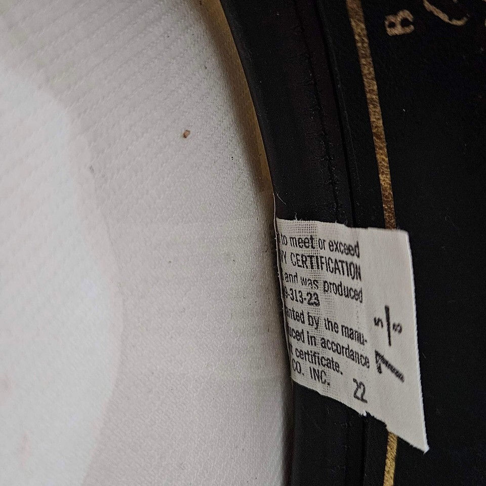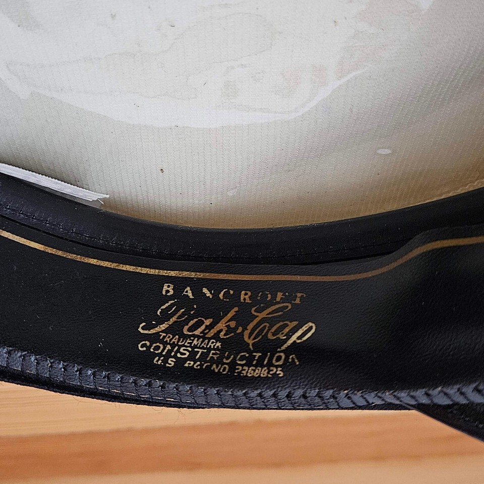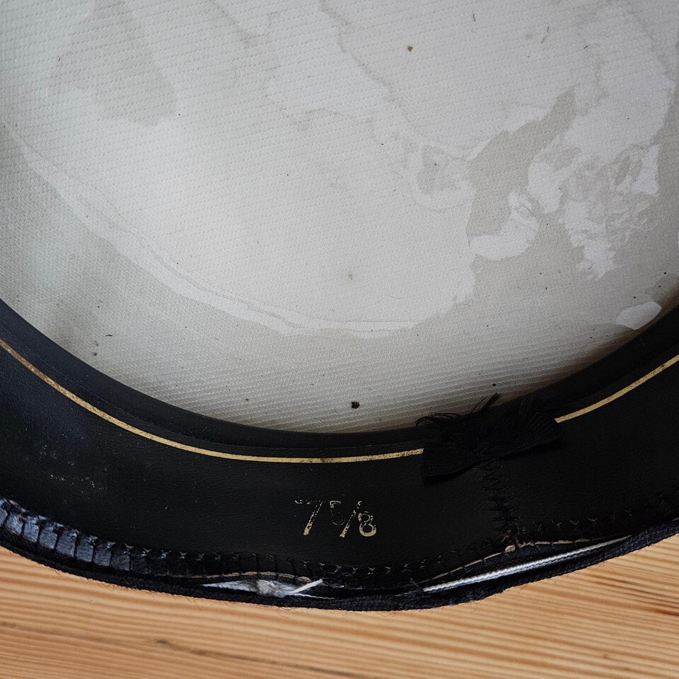 Completing the ensemble is a captain's pilot hat. The hat was made by Bancroft Pak-Cap and is a size 7 5/8. The top measures 10 1/2" in diameter. The inside has a clear plastic liner. The inside sports a vintage 1970s embossed label with my uncle's name. Please note that the lining has some tears, as shown in the photos. Also, the top of the hat shows signs of use, as it has some smudges and is slightly yellowed.