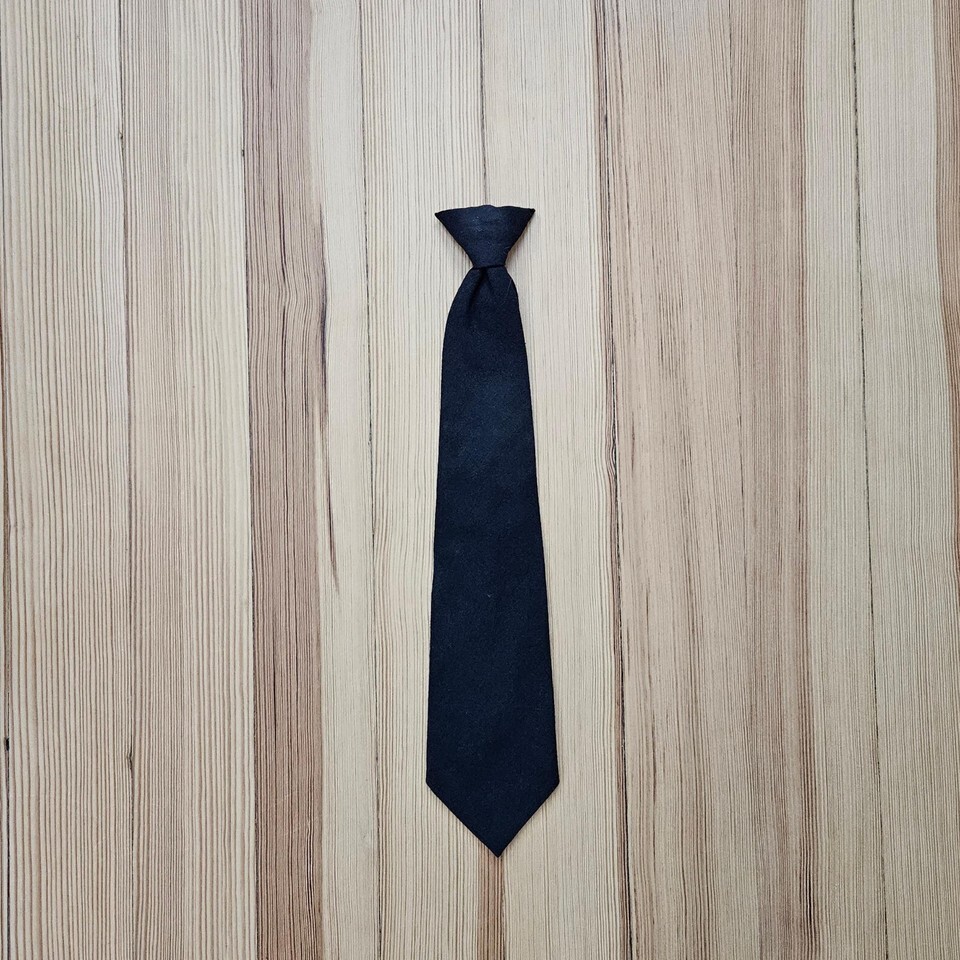 The clip-on tie that is included with the ensemble measures 16" in length and is 3 1/2' wide. There is not a label showing who made the tie, but there is a label that shows the fabric is a polyester/wool blend. The back of the tie is secured with staples, which was common in the 60s and 70s.
