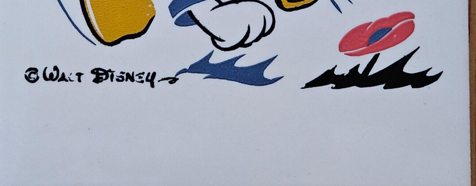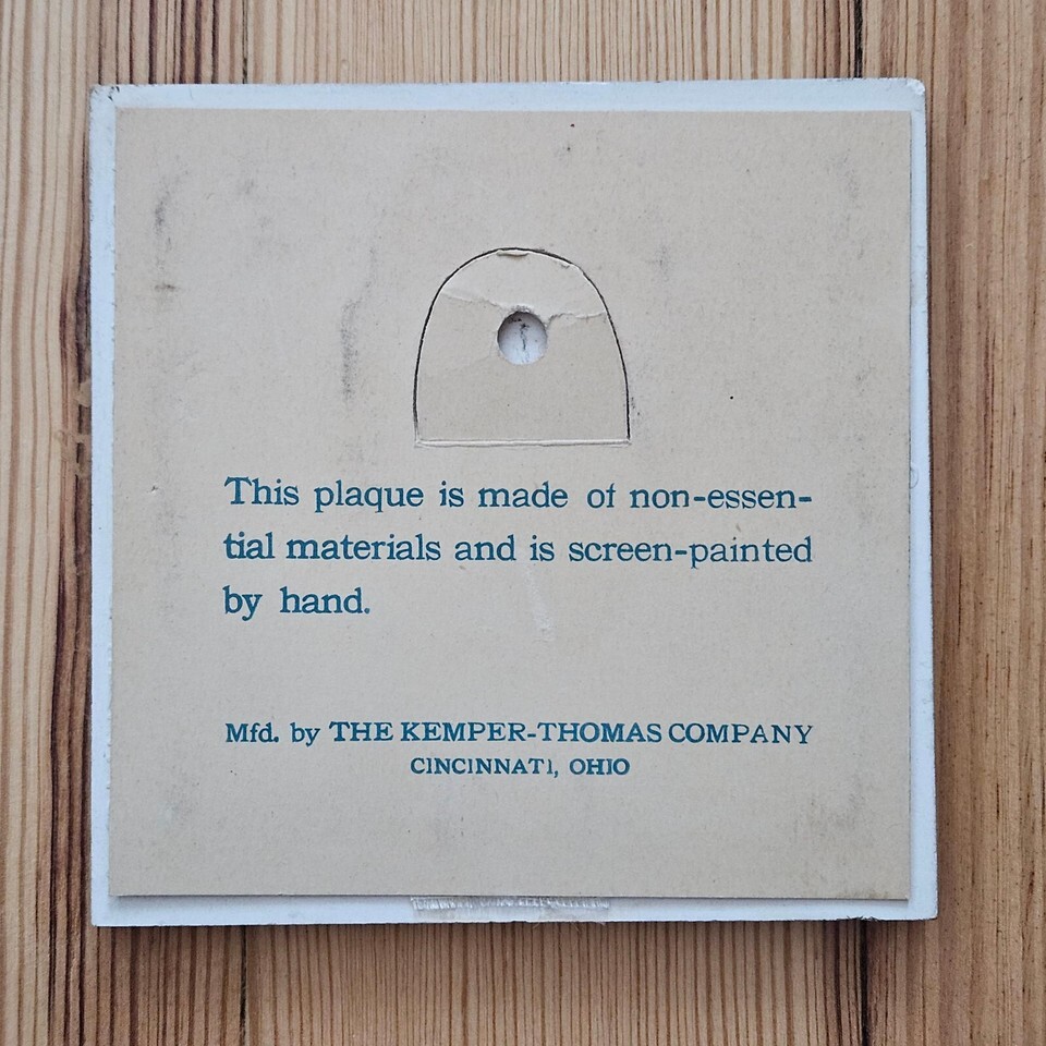 A circa 1940s Walt Disney Donald Duck ceramic tile plaque. The tile has a cute scene with a scowling Donald attempting to swat a busy bee. The Kemper-Thomas Company made the tile and the back cardboard has the following message, "This plaque is made of non-essential materials and has been screen painted by hand." According to my research, this means the tile was made during the WWII era. The tile measures 4 ” x 4 ” x ”. The tile has the original backing on it with a fold-out cardboard picture hanger that doesn't appear to have been used. The tiles may have markings under the cardboard backing, but I am unable to verify that without damaging the existing backing. The plaque is in good vintage condition, but there are a few places where the paint has flaked off, and some discoloration and smudging on the back cardboard. Please evaluate the photos for the condition.