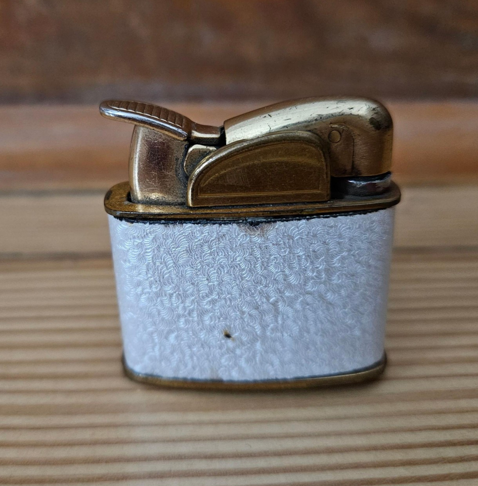 A vintage floral enamel Evans cigarette lighter. From my research, I believe this lighter is most likely from the late 1940s to mid-1950s. Key indicators include the lift-arm mechanism, compact enameled case (approximately 1.5" x 1.5"), and the screw configuration on the lighter's base, which matches Evans units produced during this period. The floral guilloche (engine-turned and enameled) finish was a popular feature for Evans decorative table lighters in the postwar era, especially from about 1947 to the late 1950s. The lighter has scratches and scuffs associated with use, please look at the photos to verify the condition. The lever works easily when pressed, however I didn't fill the lighter with fuel to verify if it works. It is being sold "As Is". The lighter measures 1.5" x 1.5". The lighter measures 1.5" x 1.5".