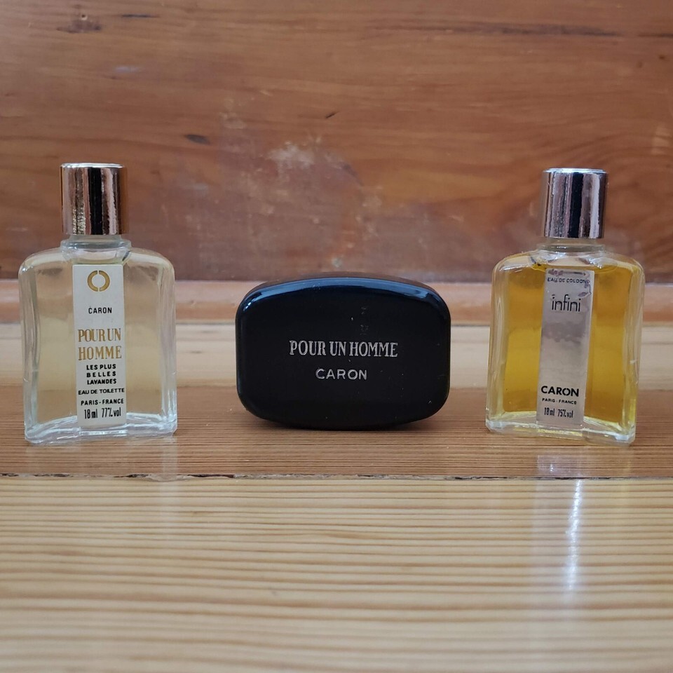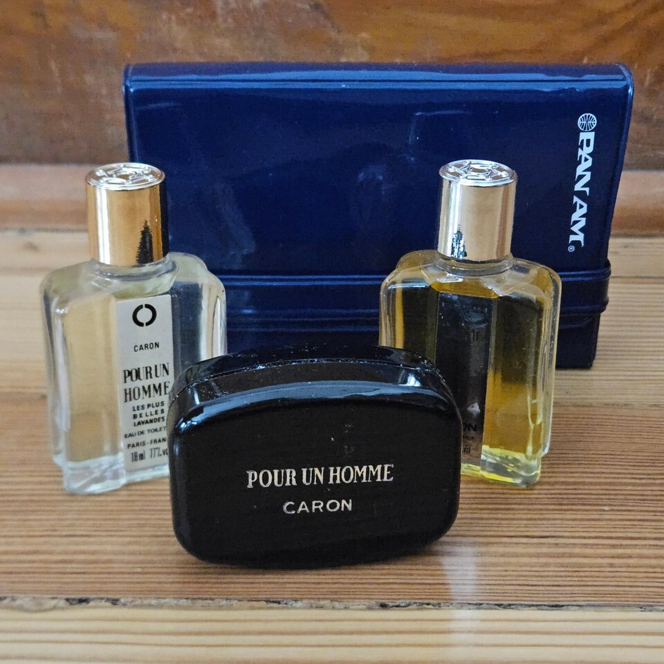 Preserve the golden era of air travel with this vintage Pan American Airlines First Class amenity bag, featuring Caron Paris fragrances. This mid-1970s collectible includes a blue case adorned with the iconic Pan American logo, measuring 4.75" x 3". Inside, you'll find luxury Caron Paris items: Pour un Homme Eau de Toilette (18 ml), matching soap, and Infini Eau de Cologne aftershave (18 ml), all made in France. While there are no expiration dates, the age of these items means their condition may vary. Note that the case shows some marring, as detailed in the photos. Sold "As Is," this amenity kit, was likely never distributed to a passenger. My uncle was a Pan Am pilot and his wife was a First Class Purser, and I found this in their collection of Pan American memorabilia.