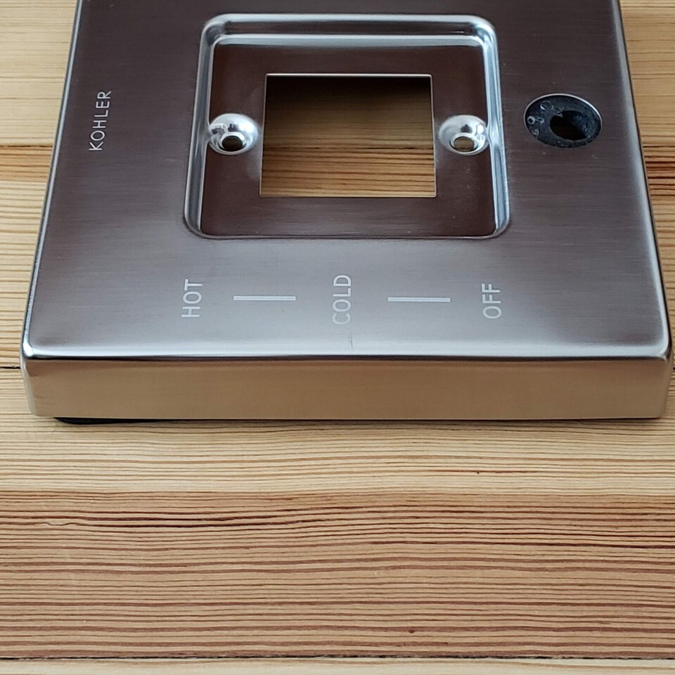 Upgrade your bathroom with the clean and modern Kohler escutcheon assembly shower trim from the Loure Collection. Crafted in brushed nickel, this contemporary trim is designed for a mixing valve with a diverter, adding an elegant touch to your shower space. Its part number is K-1139053-CP. This escutcheon trim is brand new and has never been installed.