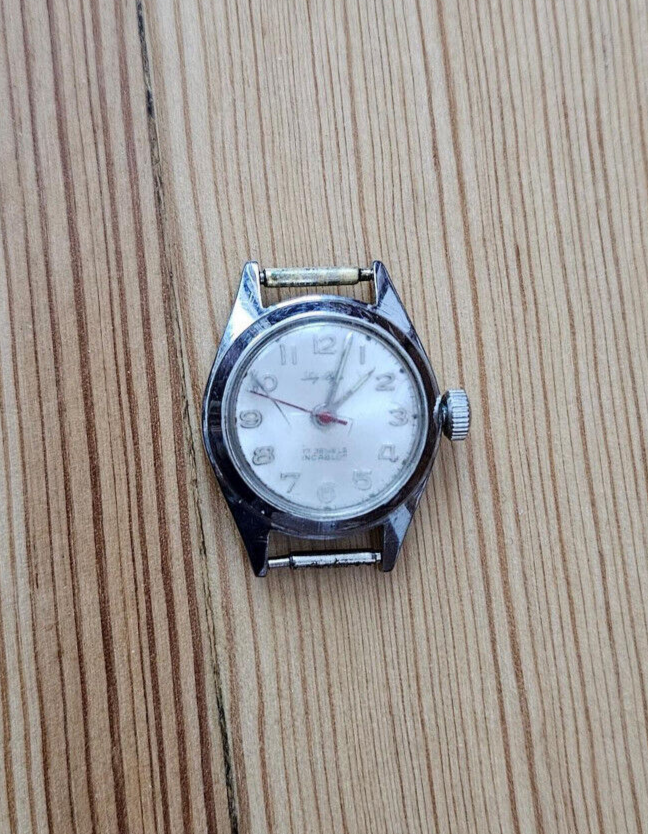 Vintage Lady Elgin wristwatch with a black suede watch band. The 17 jewel watch is shock-protected, with a stainless steel case. It is also anti-magnetic, with glow-in-the-dark hands. The watch works, but has the following condition issues. It seems to run a bit slow, it has to be wound every 23 hours or so. Also, the hands are a bit off: when both hands are at 12 they don't quite line up. The band pins are pitted and discolored, and the crystal case has a crack and is badly scratched. The watch measures 1" x 1.25" and the pins measure around 7/16". I would assume that the watch will continue to run, but due to its age, it is being sold "As Is". The adjustable black leather suede watch band is pure 1970s with metal snaps and studs. The snaps work, but some of the metal is discolored and pitted. It measures 6" x 1.25". Please look at the photos and video to evaluate the condition.