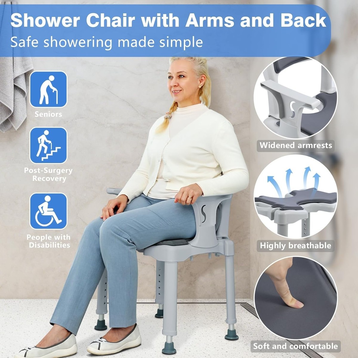 Built for Real Life: Thoughtful details for senior adults recovery. Ergonomic backrest and reinforced arm supports improve balance, while a built-in showerhead holder and anti-slip feet make daily bathing more secure and dignified