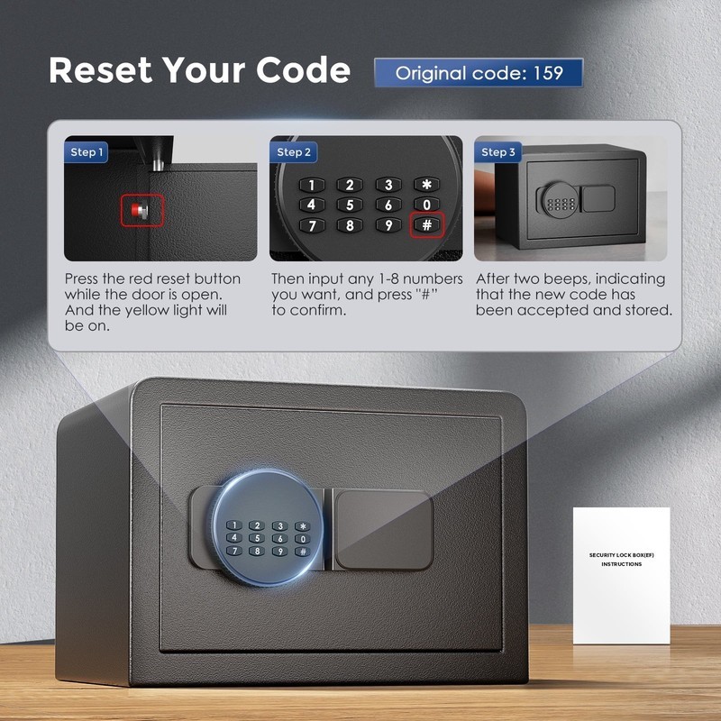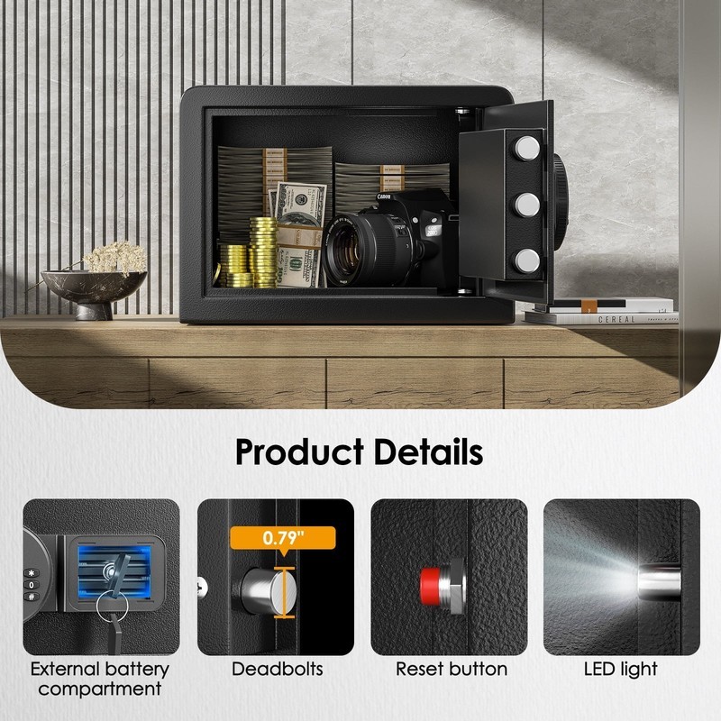 ??High Quality Safe and Durable?Our safe box is designed with 2*18mm solid locking bolts, built-in hinges, anti-collision, and anti-pry micro slits, with excellent anti-prying and anti-theft performance. External dimensions of our safes: 13.8"*9.8"*9.8". With an additional fireproof and waterproof money pocket (9.3613.65 inches), the combination safe and fireproof bag will protect your valuables from fire, hurricanes, and earthquakes. ?External battery box LED Indicator ?External battery box is a breakthrough in the market, if the battery dies without you noticing, you can open the external battery compartment to replace it, so you won't be troubled by the fact that you can't unlock small safe without the emergency key. If the red and green lights are on, this indicates that the battery has been depleted and needs to be replaced as soon as possible. ?Two Unlocking Methods?? password + rotary button, ? emergency key + rotary button. You can set a 3-digit combination for your safe. If you forget the password or the battery is dead, you can use the hidden emergency key to open the sentry safe fireproof waterproof box. (please keep the emergency key out of the safe). The default password is "159". ?Double Alarm Design?Three times to enter the wrong password safe fire waterproof will sound a warning beep lasting 60 seconds, enter the correct password to stop the alarm. Violent knocking will also trigger the alarm system. ?Easy to install?If needed, the fireproof safe boxes for home have pre-assembled holes in the back so you can easily secure them to keep your valuables safe. Also, the compact size of 0.7 cubic feet is easy to conceal in a drawer, cabinet, closet, or nightstand. ?365 Day Free Key Replacement?If you lose your key, we can send you a new one. We have a 24-hour online customer service. If you have any questions or have any questions, please contact me at the first time. SPECIFICATIONS: Brand: SRWTRCHRY Material: Steel plate Color: Black Product Size: 12.2*7.9*7.9 inches Product Weight: 17lbs. Power supply: 4*AA batteries (not included in the product) Capacity: 0.7 Cu. ft. Package Include: 1*Electronic Digital Safe Box, 4*Expansion screw, 2*Emergency key, 1*Pad blanket, 1*Fireproof Bag, 1*Manual