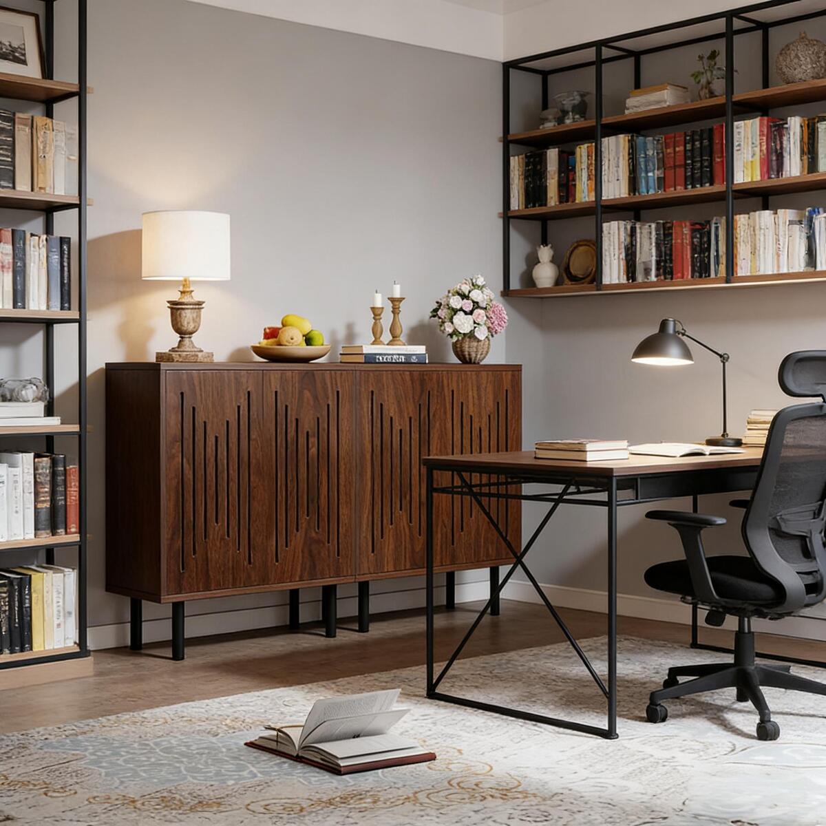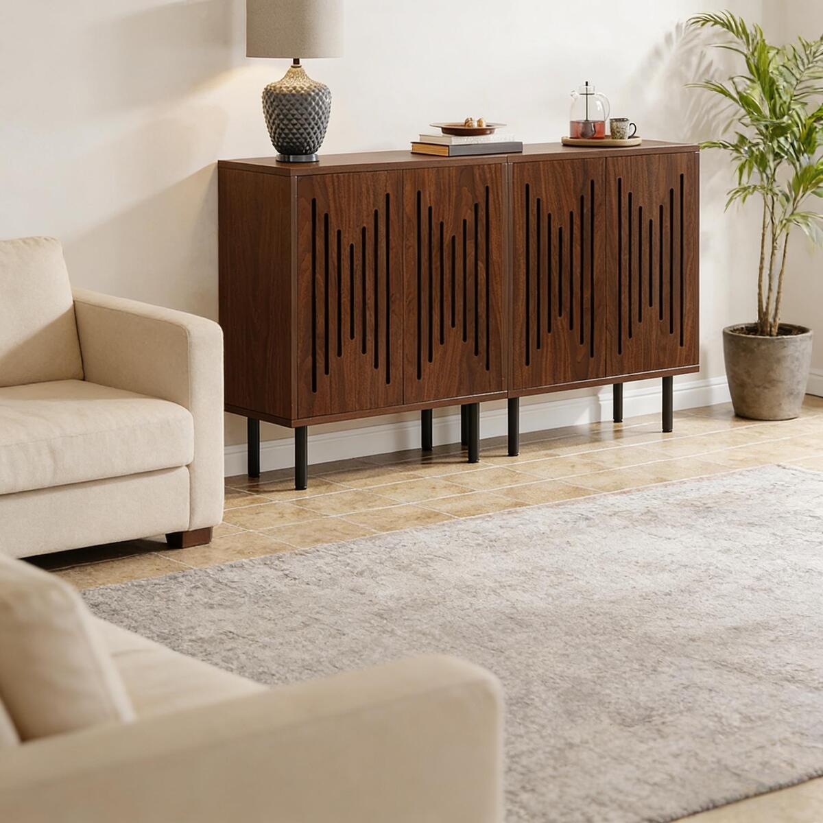User-Centered Design - This sideboard cabinet features innovative built-in rebound devices instead of traditional door handles, minimizing bumping accidents. The 6.5'-high metal legs make floor cleaning easier.