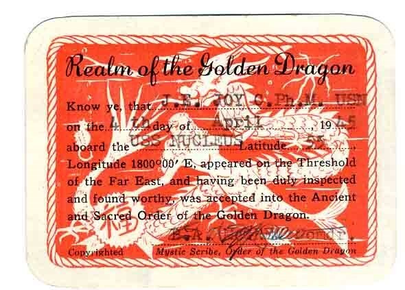 A Realm of the Golden Dragon Card issued in 1945 to a sailor on the USS Nucleus when Crossing Longitude 180. The sailor was accepted into the Ancient and Sacred Order of the Golden Dragon. Measures about 3 1/2" x 2 3/4" and the back is blank. One of the Line Crossing Ceremonies