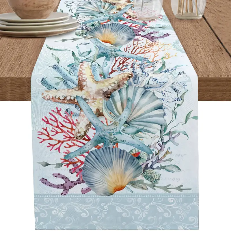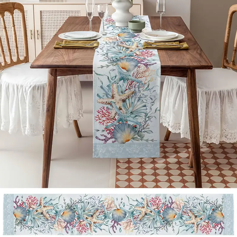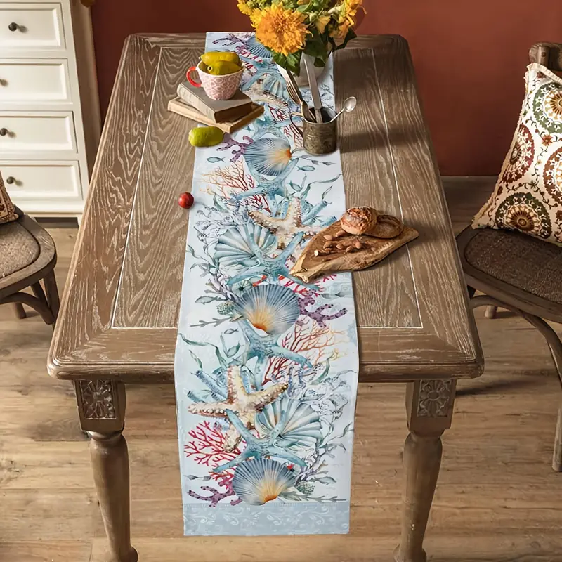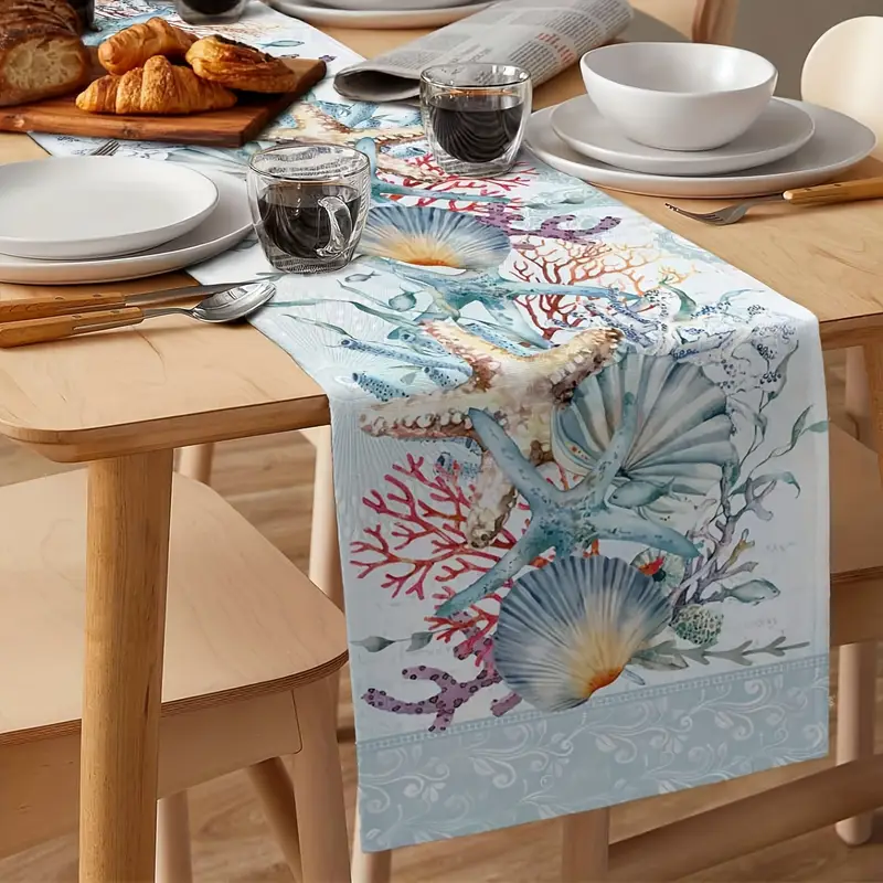 This Blue Ocean Coastal Theme Table Runner features a Modern Linens design with a charming Ocean Life pattern, perfect for adding a touch of sea life to your dining table.