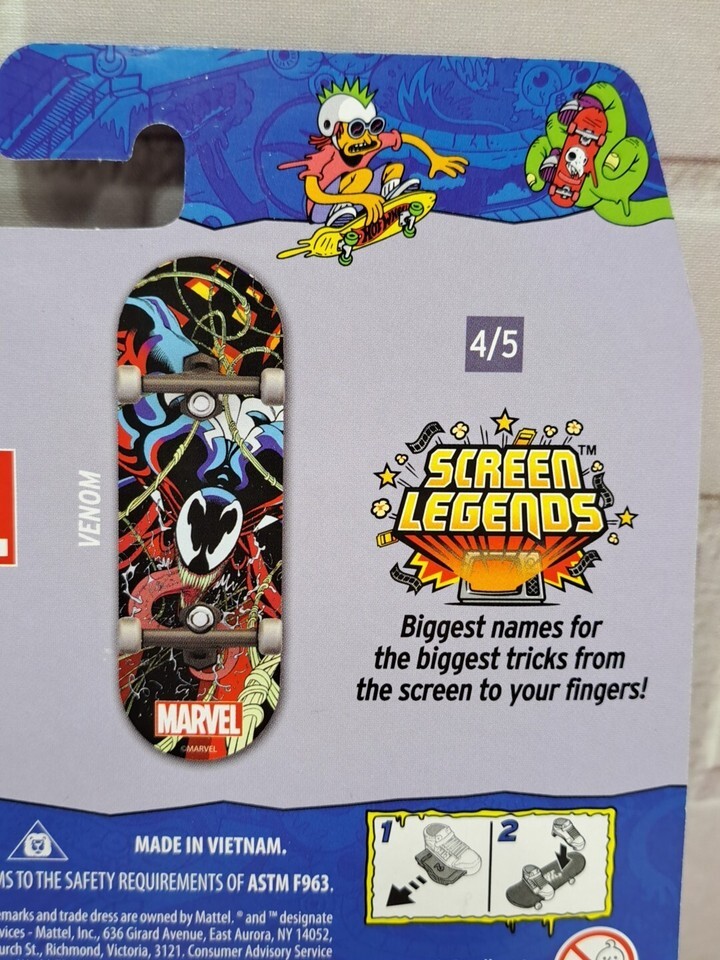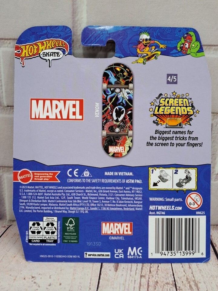 Get ready to add an epic piece to your Hot Wheels collection with this rare Skate Fingerboards Marvel Series VENOM 4/5 Screen Legends fingerboard. Featuring the iconic character Venom and a striking 96mm scale, this original, licensed reproduction by Mattel is a must-have for any skateboarding fan.