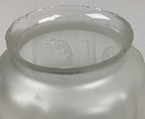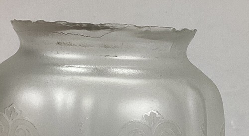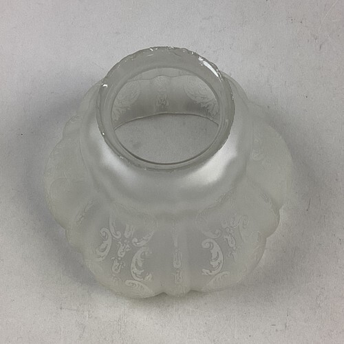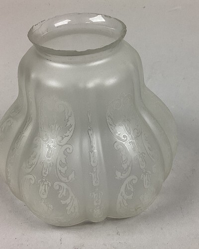 You are bidding on an antique etched, frosted glass lamp shade. This is in used condition. There are some spots/marks on the glass from age and normal use. But there?s no cracks or chips in the body of the glass that I noticed. Where there is damage is the top edge. You can see the damage in all the pictures but if you have any questions about the condition, feel free to send me a message.