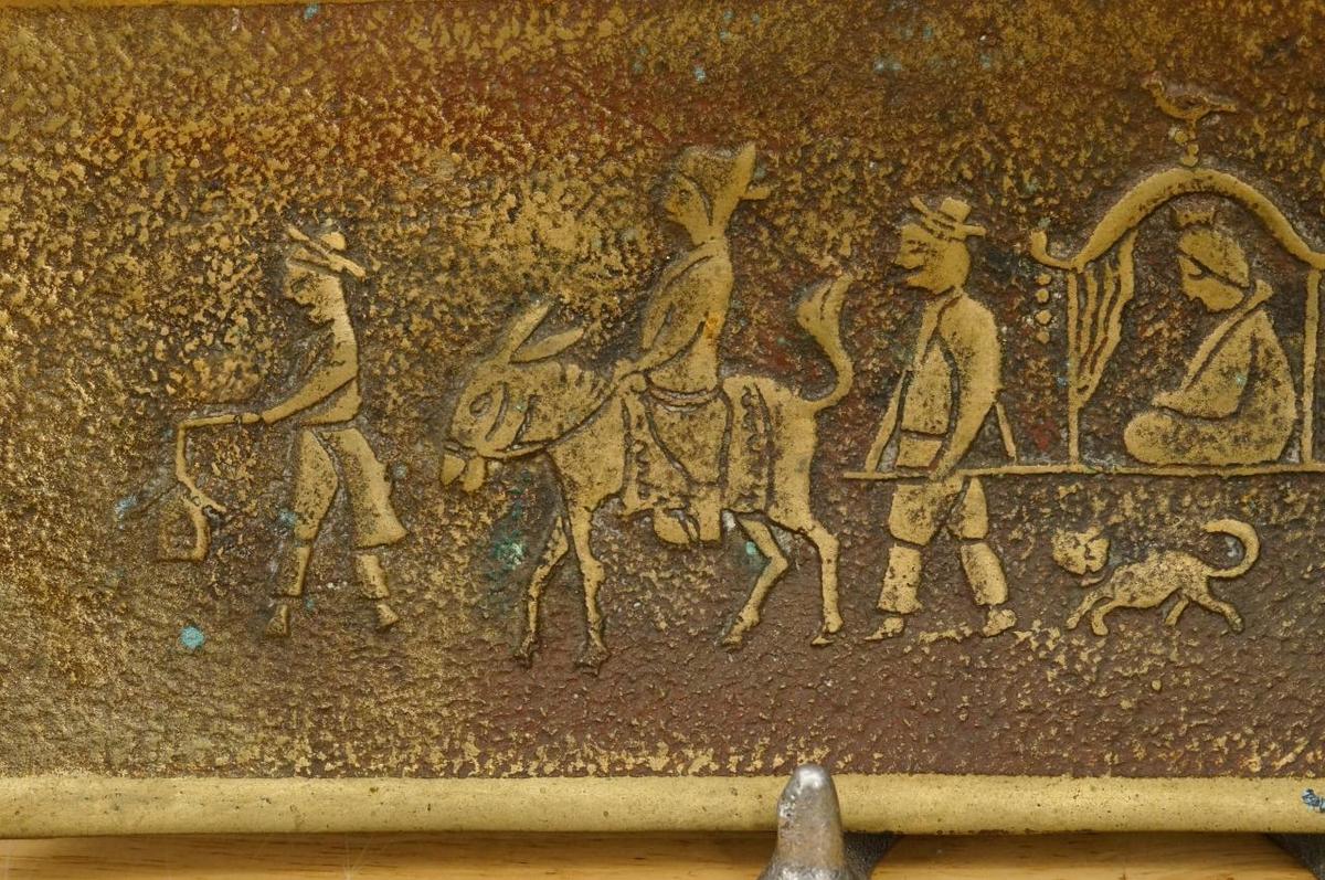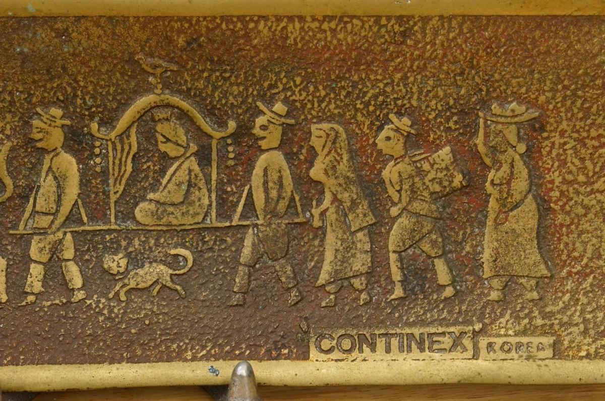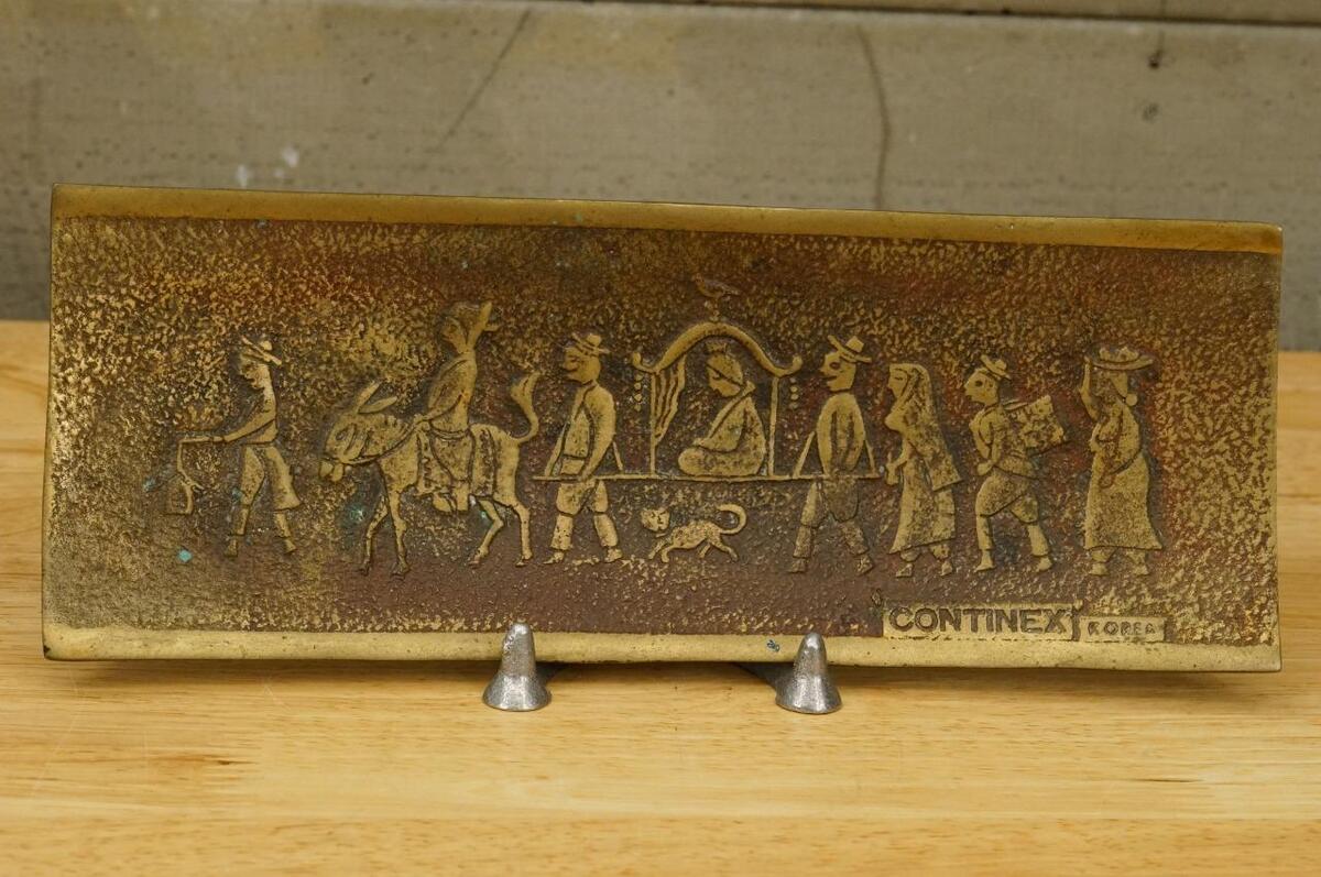 Vintage Korea Continental Carbon Co Start Up Ceremony Solid Brass Tray 1969 - measures 11" by 4-1/8" - - featuring folk art image in relief with a wealthy man in a palaquin. Also known as Continex Co.