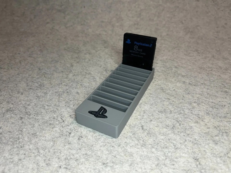 Keep your classic PlayStation 2 saves organized and easily accessible with this custom storage holder. This gray tray is 3D printed and designed to securely hold up to 10 official PS2 memory cards. It features a classic PlayStation logo on the front, making it a great display piece for any retro gaming setup. This compact organizer is the perfect solution to prevent losing or damaging your valuable game data.