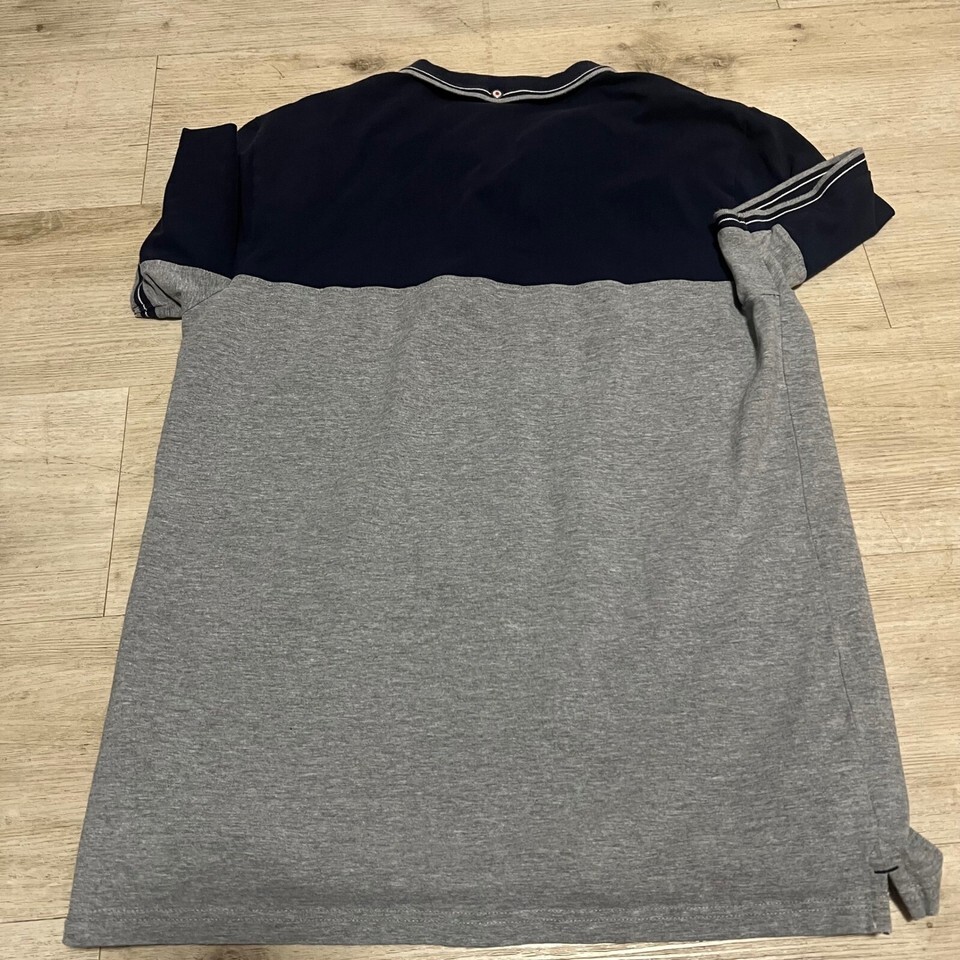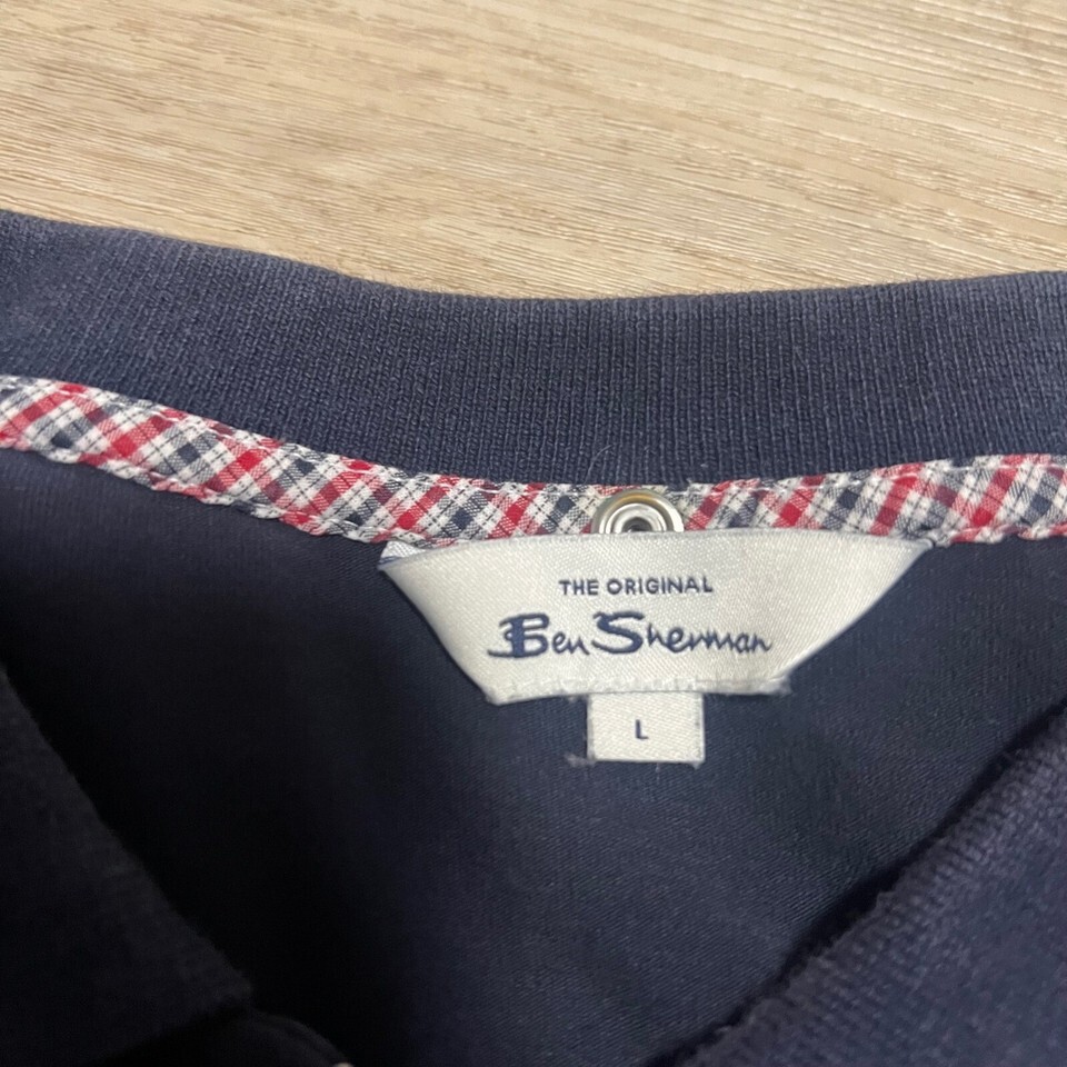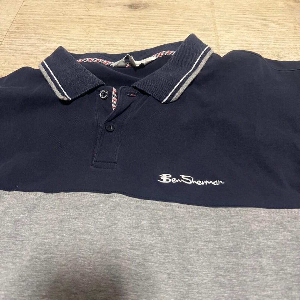 Keywords: Ben Sherman, polo shirt, mens polo, color block, short sleeve, casual shirt, menswear, navy blue, gray, size L, classic fit, modern style, embroidered logo