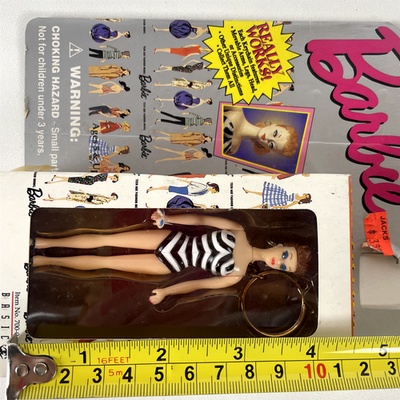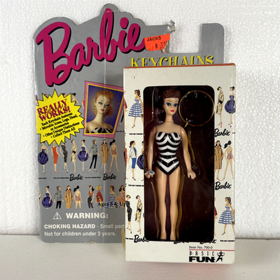 Presenting a classic Barbie keychain from Basic Fun Inc., featuring the iconic "Original BARBIE? Introduced 1959" character. This figural keychain replicates the beloved doll in her signature black and white striped swimsuit, complete with movable arms, legs, and head, offering a charming and interactive accessory. The item is part of the "Barbie KEYCHAINS" product line, identified by Item No. 700-0.