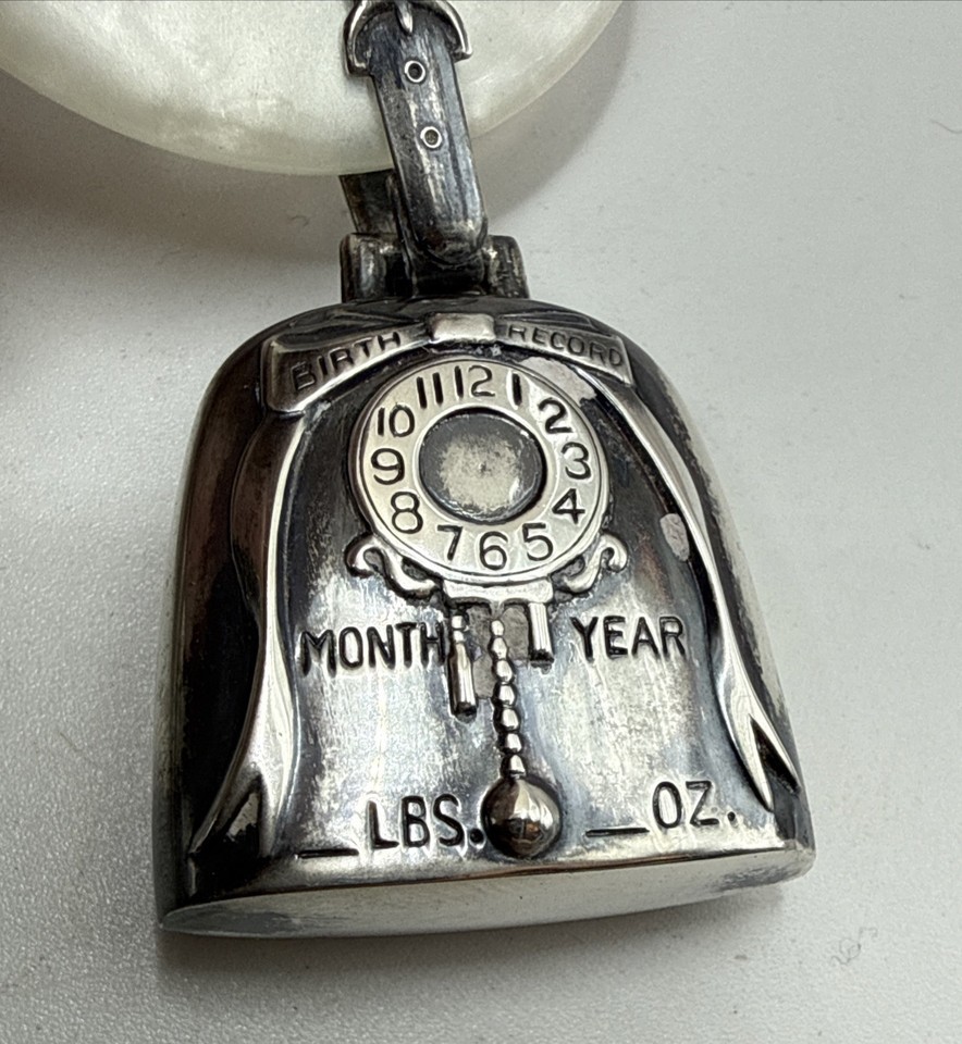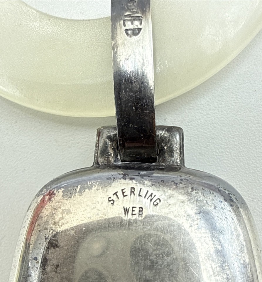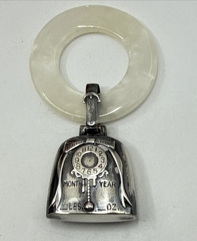 This WEB Sterling Silver Baby Rattle with White Mother of Pearl Teething Ring is a unique and antique piece perfect for teething babies. Made from sterling silver with a beautiful Art Deco style, this teething rattle features a Birth Clock pattern and originates from the United States. The combination of the intricate design and high-quality material makes it a beautiful and functional addition to any collection or a special gift for a baby's christening or milestone. The whole piece is about 3 inches long.
