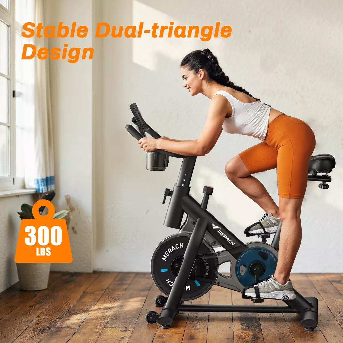 Stable Dual-Triangle Frame: Stationary bikes for home with a 300 lb weight limit made of durable thickened stainless steel; the 15 lb flywheel and unique triangular frame structure ensure stability when riding. Suitable for all fitness levels