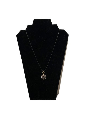 This pendant is a stunning piece of handmade jewelry featuring a round design with gold and silver accents on a black leather cord. The combination of the silver color and the gold accents creates a stylish and elegant look that is perfect for any outfit. The pendant is versatile and can be worn for various occasions, making it a must-have accessory for any jewelry collection.