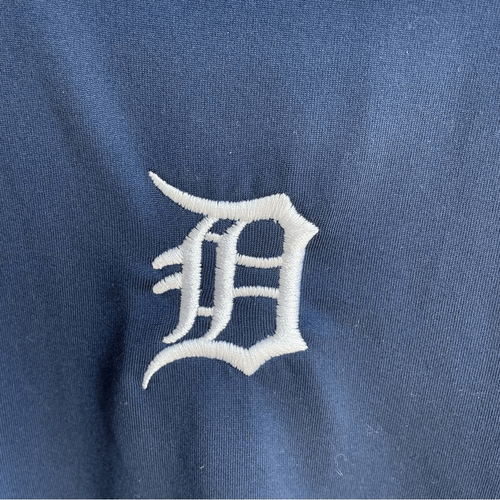 Dark blue and Gray, Columbia brand, Detroit Tigers, MLB, short sleeve golf shirt. Embroidered old English D at the chest and Columbia branding at one sleeve. Performance fabric made of 100% polyester. Measurements are approximate and taken while laying flat: 26 inches shoulder to hem and 19 inches armpit to armpit