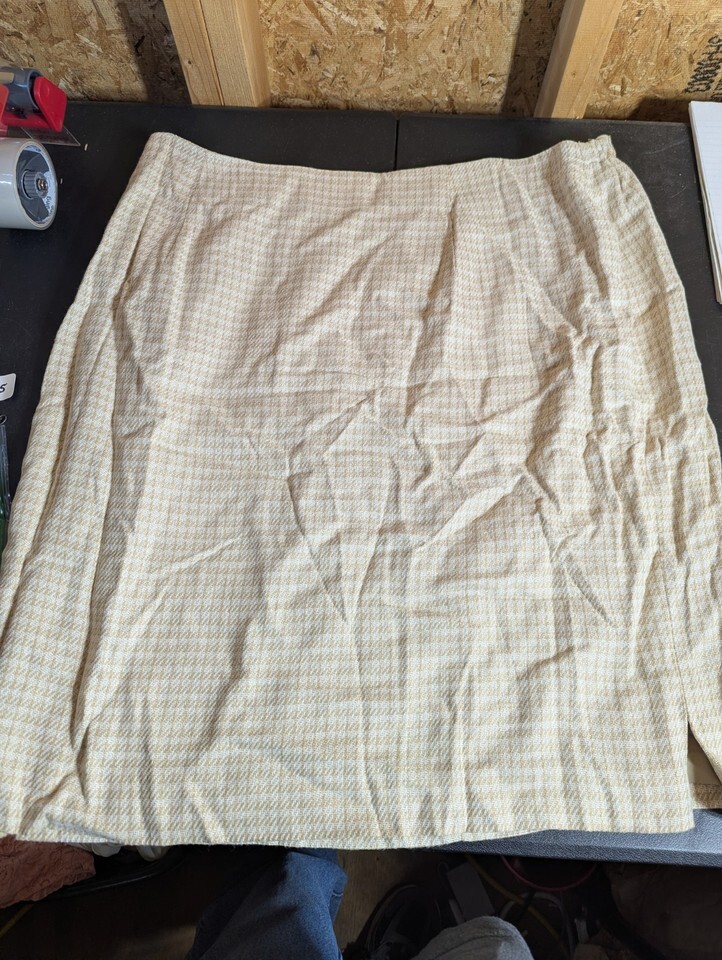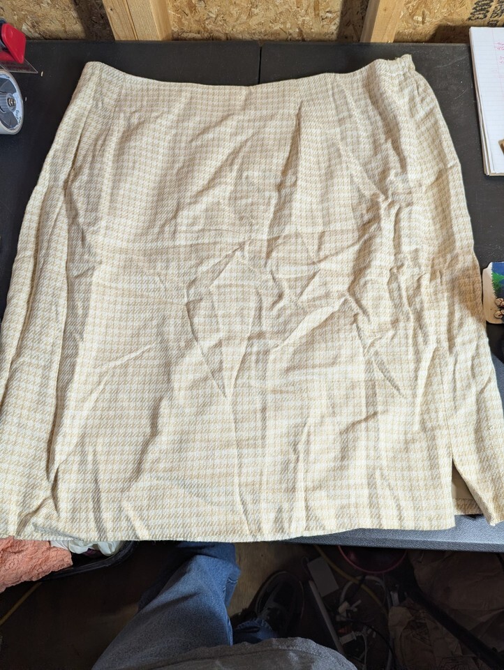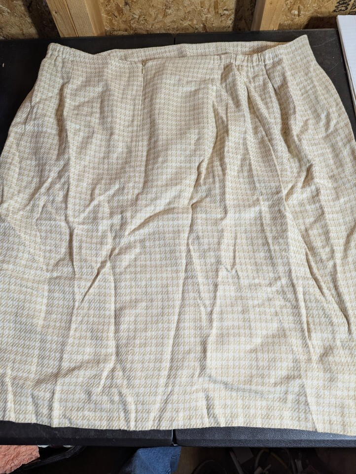 This Jones Wear size 24W rayon skirt features a check pattern in beige color, making it perfect for both party/cocktail and business occasions. The A-line skirt falls to knee length and is made of knit fabric, with a zip closure and lining for added comfort and style. Designed for all seasons, this skirt is a versatile addition to any wardrobe, representing quality craftsmanship from a reputable brand in the United States. 42" waist and 26" length