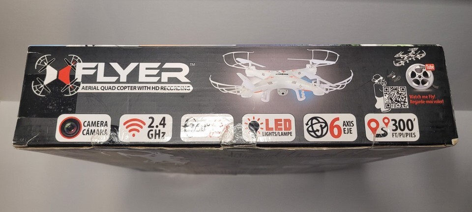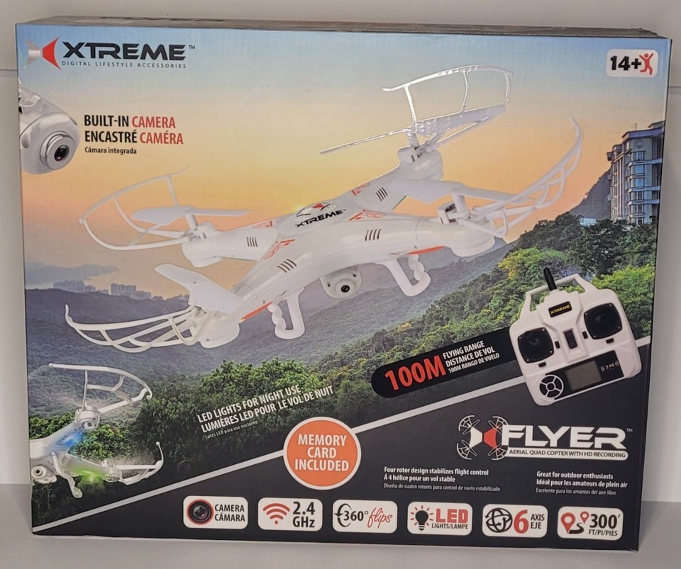 The Xtreme FLYER Aerial Quad Copter is a white, electric-powered remote-controlled quadcopter from the brand Xtreme. It features a 100M flying range and comes with HD recording capabilities, making it perfect for capturing stunning aerial footage. This model is designed for enthusiasts looking for a high-performing and versatile aerial vehicle to enjoy soaring and recording their adventures from above.