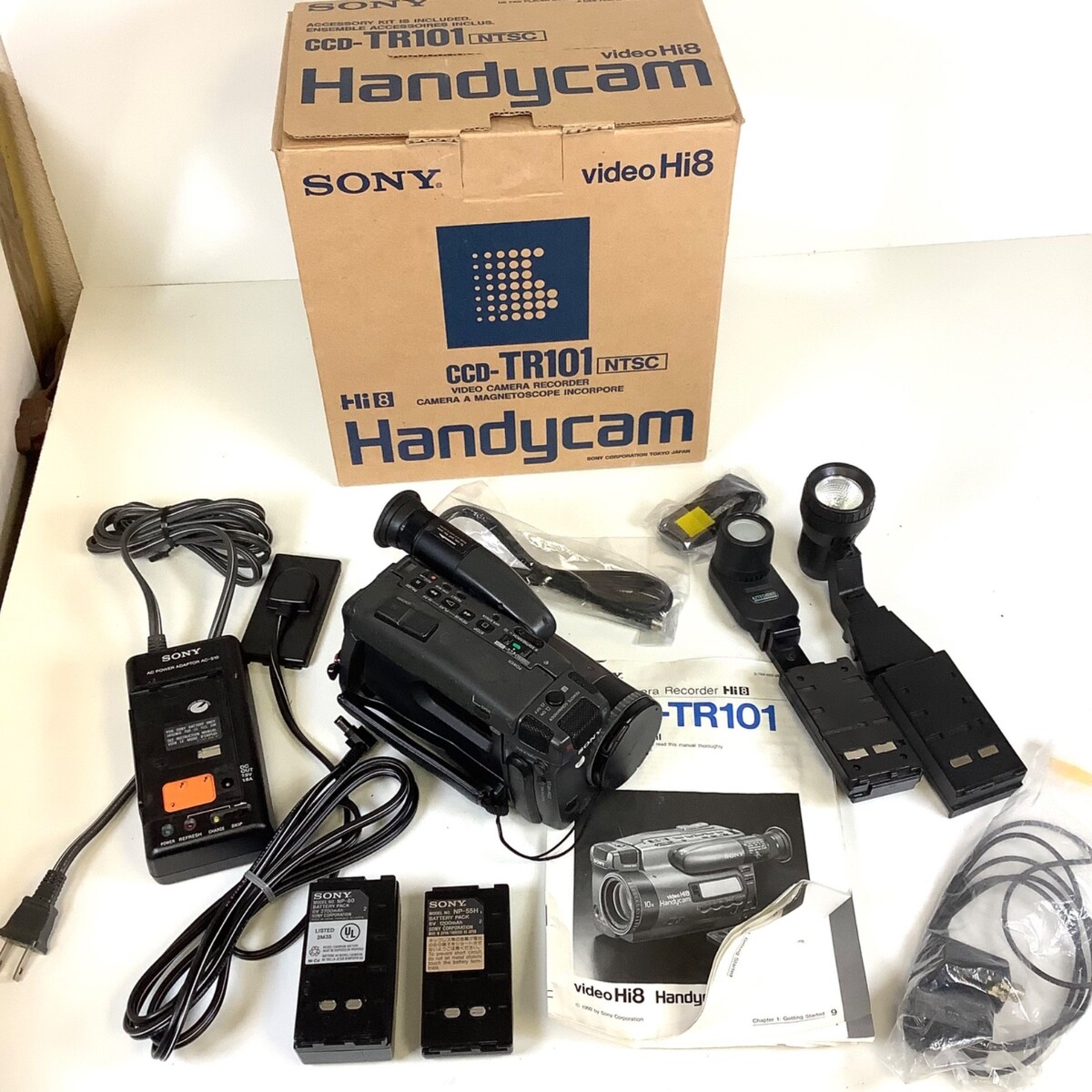 Vtg Sony Handycam Video Hi8 CCD-TR101 + Charger Batteries RFU Adaptor UNTESTED. UNTESTED. The video recorder powers on and buttons seem to work. I just could not see a clear playback picture - it had diagonal stripes through it. But this comes with batteries, battery charger, two lights or flashes, the original box, original manual, what looks like an AV cable, and an RFU?90UC adapter. Please see all photos.