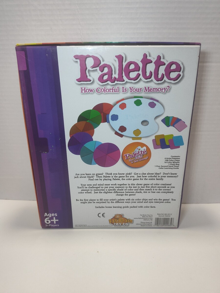 Fat Brain Toy Palette Color Game How Colorful Is Your Memory? (2011) is a fun and colorful memory and matching game from Fat Brain Toy Co., perfect for family game night, classroom play, or fun with friends. Designed for 2 or more players ages 6 and up, this game challenges players to test and sharpen their memory skills by matching shades, tints, and hues of color.