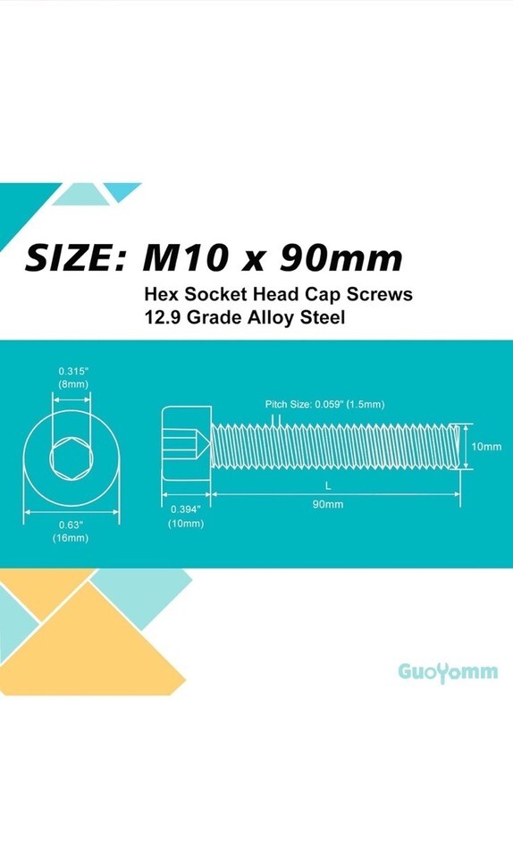 The M10-1.5x90 Stainless Socket Allen Head Bolts by Guoyomm are high-quality 12.9 grade steel screws with a sleek black oxide finish. These socket screws have a hex-key drive style and round head design, making them versatile for various fastening applications. With a thread size of M10-1.5 and a length of 90mm, these screws come in a pack of 6, offering durability and reliability for your industrial hardware needs. Please note the California Prop 65 Warning associated with this product.