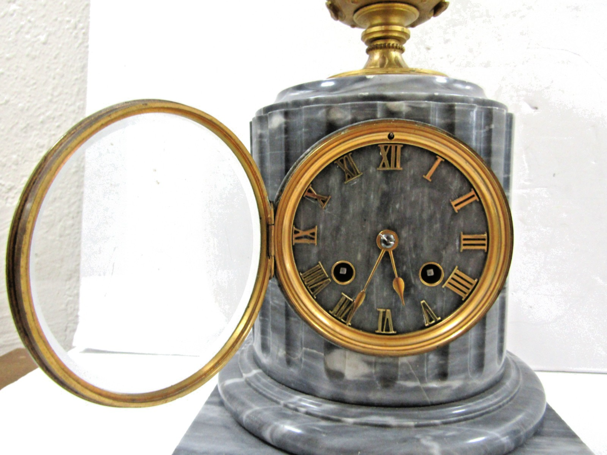 This French Empire Gilt Bronze Brûle-Parfum Onyx Columnar Mantle Clock from the early 19th century is a stunning piece of vintage decor. The clock features a mechanical movement with Roman numerals, housed in a gilt bronze frame with a gray and gold color scheme. The clockworks are signed and this original piece exudes a French Empire style, perfect for any room in a Victorian-era home. Made in France, this clock adds a touch of elegance and history to any space.