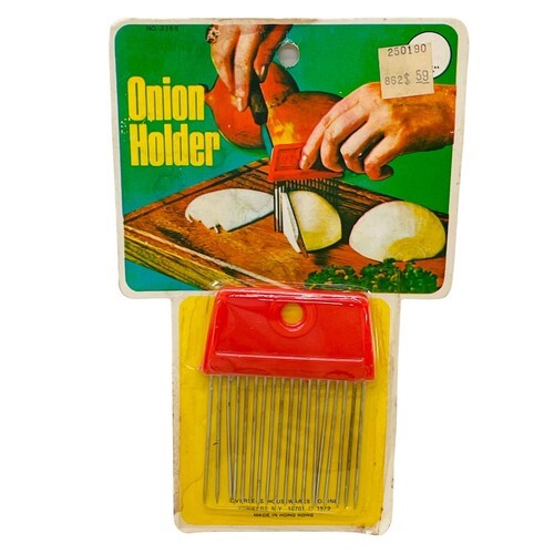 The set includes one onion holder and is compatible with all types of onions. The antique-inspired style and food-themed design make it a great addition to any collection. The unit is an original product from Overseas Housewares Co, manufactured in Hong Kong during the 1970s. Add this fun and functional gadget to your kitchen tools and gadgets collection today!