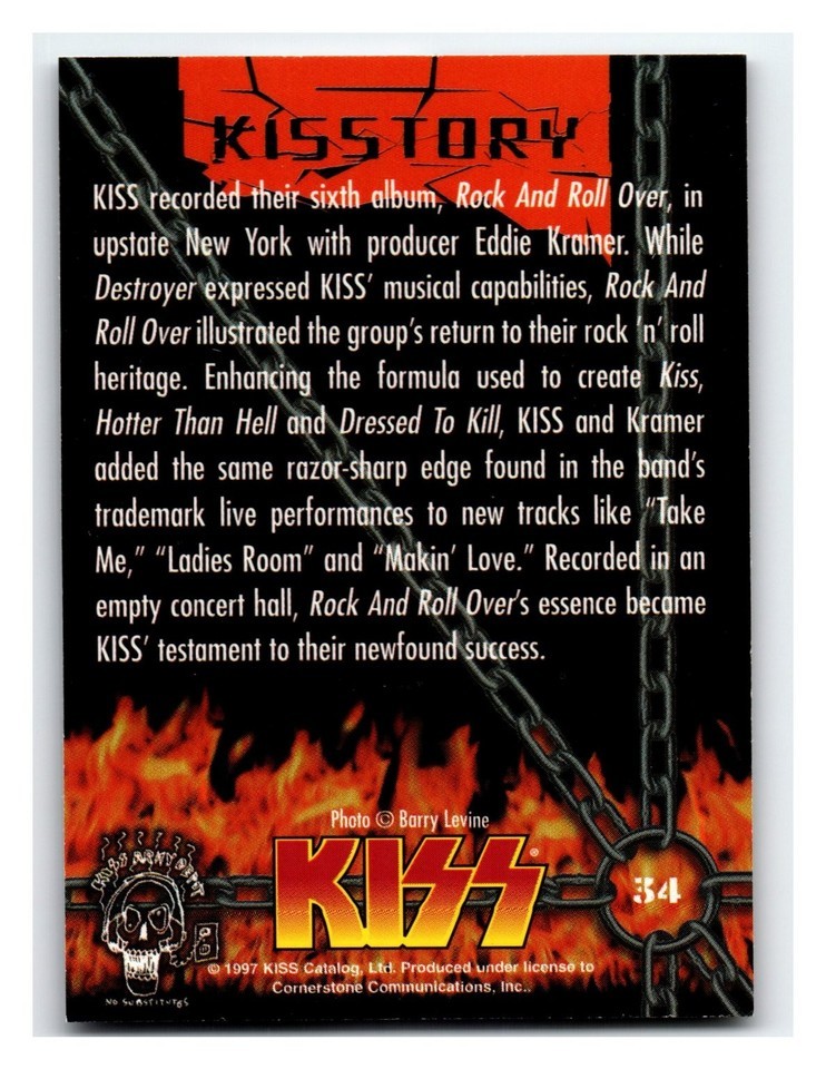 The reverse side provides fascinating details about KISS's sixth album, "Rock And Roll Over," highlighting their return to a hard rock heritage with tracks like "Take Me," "Ladies Room," and "Makin' Love." This card, with photography credited to Barry Levine, perfectly encapsulates the band's powerful presence and their enduring legacy. It's a fantastic piece for enthusiasts of KISS, rock and roll history, and non-sport trading cards.