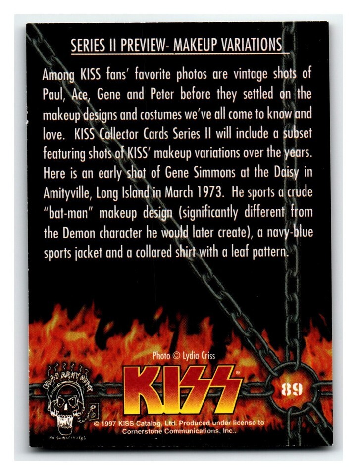 Discover a unique piece of KISS history with this 1997 KISS Collector Cards Series II #89 featuring Gene Simmons. This card is a special "SERIES II PREVIEW" from the highly sought-after "MAKEUP VARIATIONS" subset, showcasing an early and distinct "bat-man" makeup design worn by Gene Simmons. Produced by KISS Catalog, Ltd. under license to Cornerstone Communications, Inc., this card offers a rare glimpse into the band's iconic evolution.