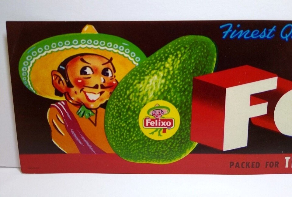 Felixo Avocados Crate Label 1950's Man In Mexican Sombrero Hat Vintage Original