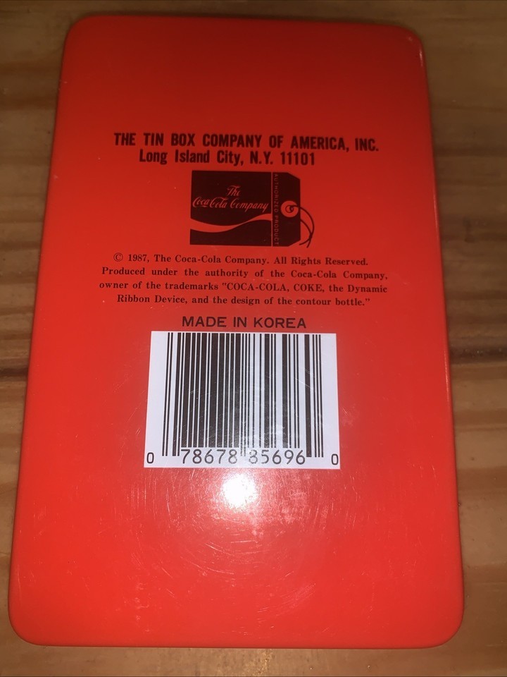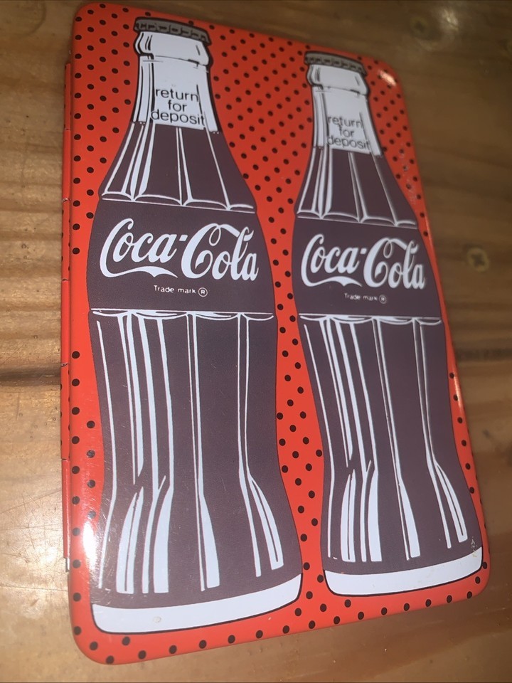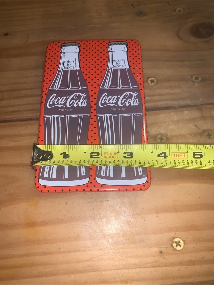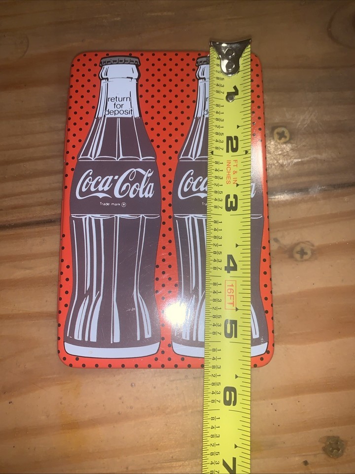 The product is a vintage 1987 Coca Cola metal address book case, measuring 5.5 x 3.5 inches. This collectible item serves as a unique and nostalgic piece of Coca Cola advertising memorabilia. The colorful design and branding make it a desirable item for collectors of vintage merchandise. Perfect for storing business cards or as a decorative piece, this retro address book case is a charming addition to any collection of Coca Cola memorabilia.