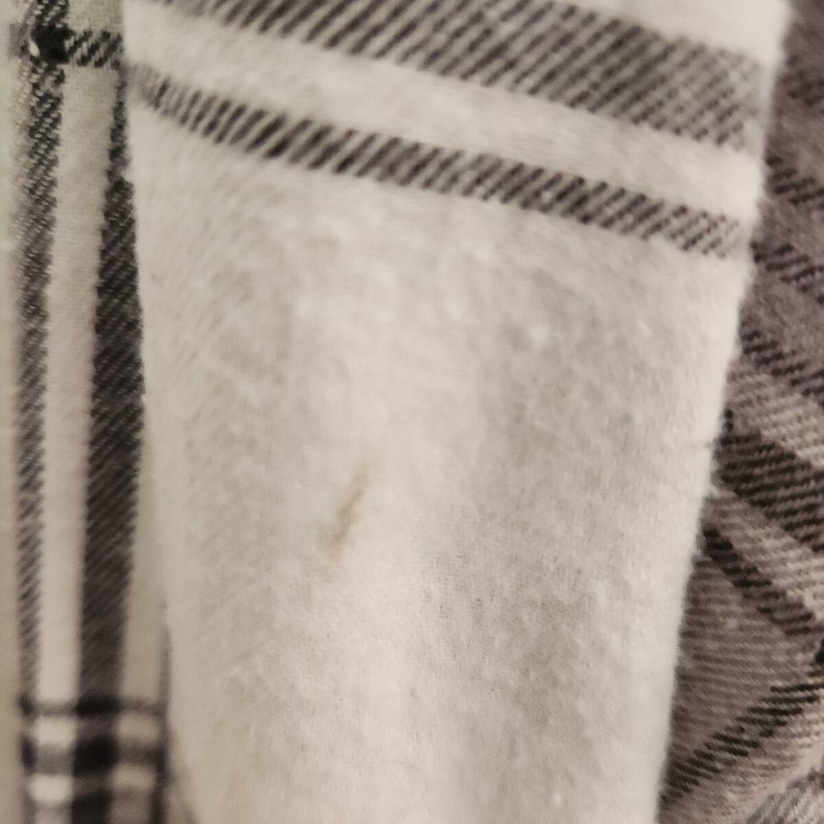 One pencil or a pen mark on sleeve (see photo). Did not come out after cleaning.