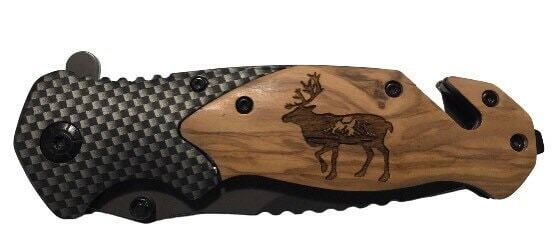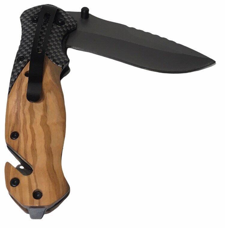 Laser engraved folding tactical knife with lock blade, great for any outdoor activity. The handles are made from natural olive wood with unique grain patterns, making them all a one of a kind.