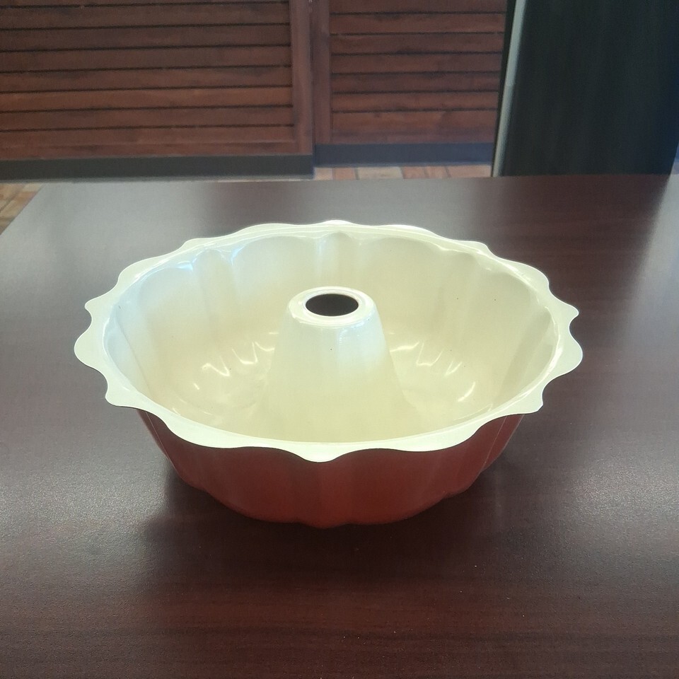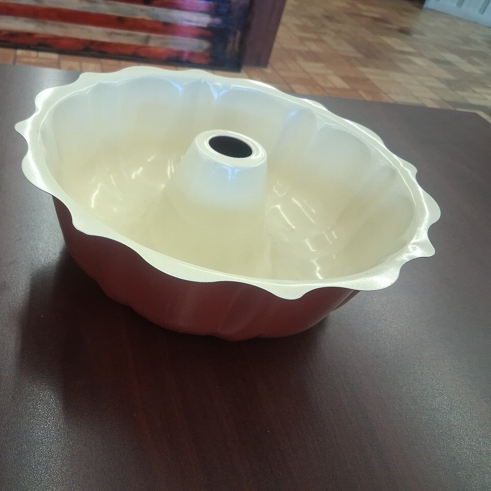 The Burgundy and Cream Nordic Ware Fluted Enamel Bundt Pan is a vintage baking mold that adds a touch of elegance to your kitchen. This Bundt Cake Mold features a stunning red color with a bundt ring shape, measuring 4" in height and 10" in width. Made of enamel, this collectible item from Nordic Ware is perfect for creating beautifully detailed cakes for any occasion. Upgrade your bakeware collection with this stylish and functional bundt fluted tube pan.