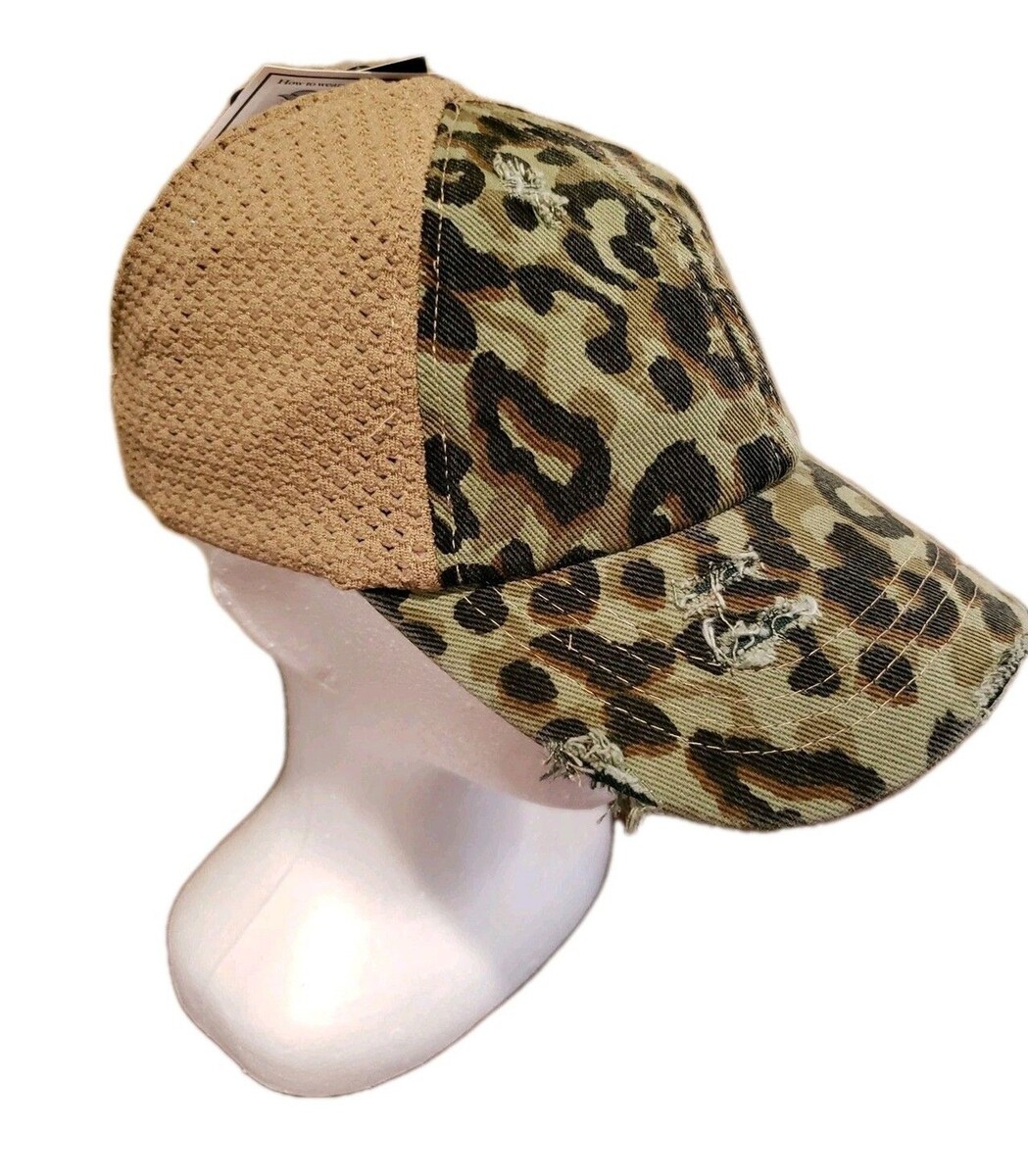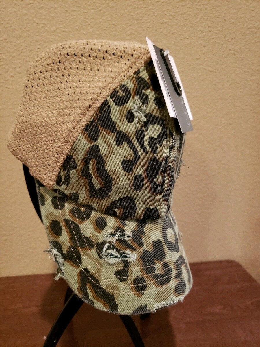 C.C. Green Leopard Print Distressed Hat Vintage Pony Cap with Knit Mesh Back