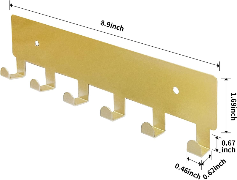 ?Specification?Color: Gold. The size of the entire product is 8.9(L)x1.69(W)inches, and the maximum bearing weight: 22 lbs. . Single Hook Size: 0.67 (L) x0.62X (D) x 0.46(W) inches. The unique six right Angle hooks won't let your items slip off easily, and each hook can hold up to 18 pounds.