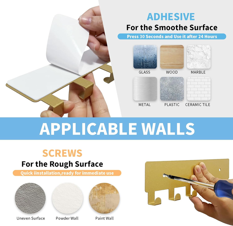 ?Easy to Install, 2 Installation Methods? 1.Self Adhesive: Just clean and dry target surface, peel off protective film, then press the Key hook holder on smooth surface for 10 seconds. Note: plaese wait 24 hours before used. 2. Drilling: Drilling on surfaces, such as wallpaper and painted walls by drilling holes.