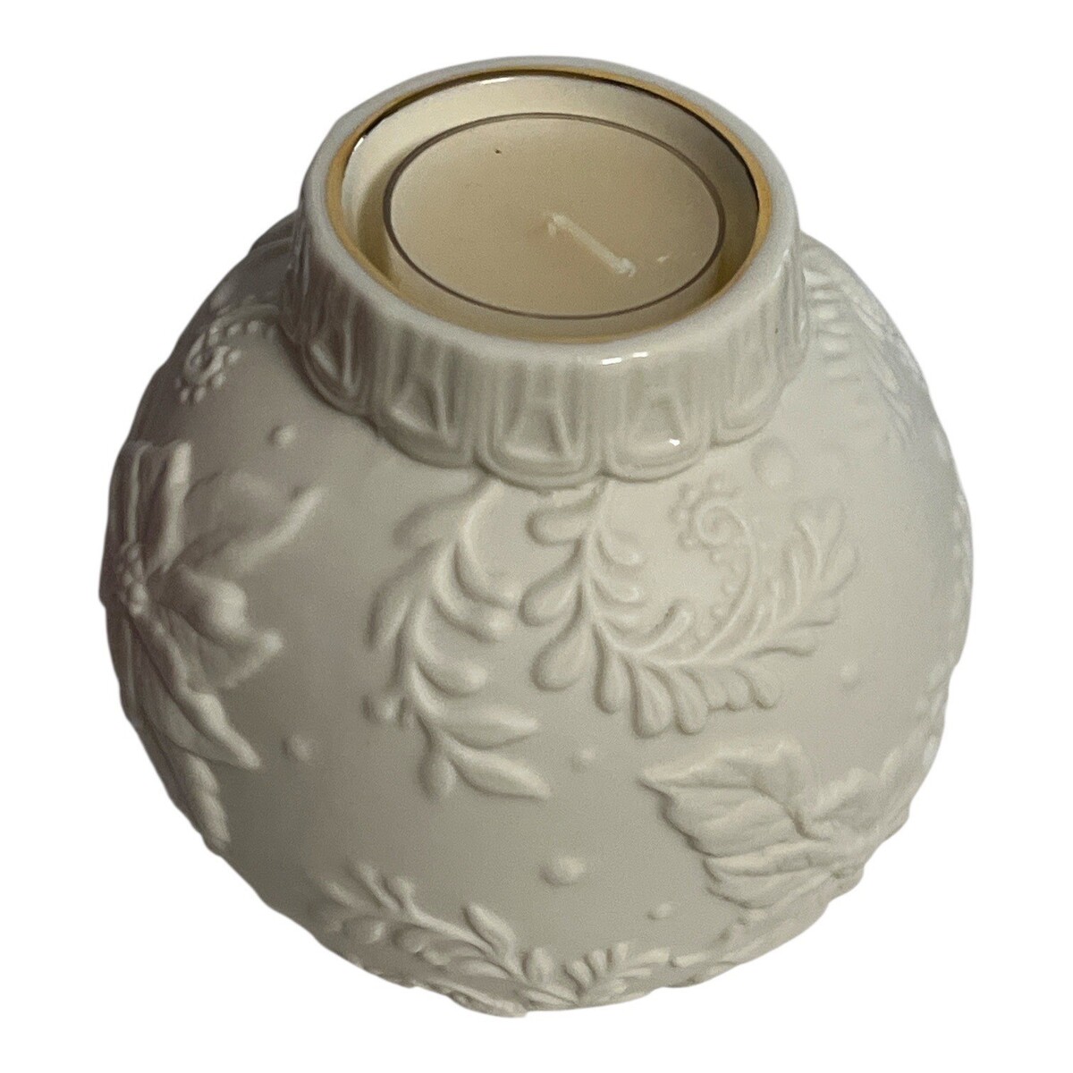 Lenox Ornamental Glow Poinsettia votive candle holder from the American by Design collection. This ivory porcelain globe features raised poinsettia and evergreen detailing with a softly sculpted collar rim trimmed in gold. Designed to hold a votive candle and create a warm holiday glow.