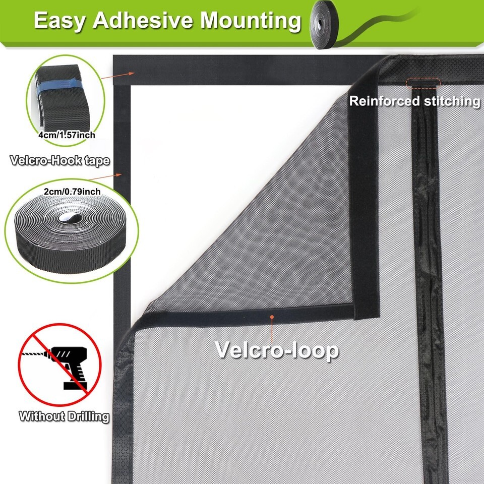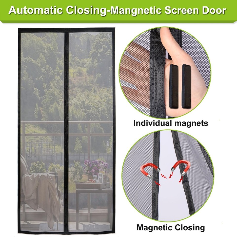 Upgraded Mesh: The mosquito net door is made of high quality reinforced polyester, our screen door mesh is woven in a newly diamond orientation, the appearance is simple and elegant. Both ventilation and anti-mosquito function at the same time,Keep Bugs Out: The holes in the mosquito net are very small, It effectively prevents the entry of mosquitoes, bees, and flies; The black color mesh are able to achieve the "invisible" effect perfectly, you can enjoy a clear view through the net screen,Self Closing Quietly: Thanks to more than 34 powerful magnets equipped with, screen door can open easily and close automatically after you pass through, it is friendly to children and pets, don't worry about pets getting in and out of the screen door,Exquisite Workmanship: Adopt abrasion-resistant wrapping cloth, avoid abrasion or deformation, preventing the escape of magnets. Magnetic mesh screen has 1 pair of chrome plated iron bars at the bottom, prevent the screen from being blown open by the wind,Fit Door/Window Size: Mesh Screen itself size is 34inch width x 70inch height, fits door opening size up to 32x68inch. The screen curtain size dimensions include the edges, please measure the door outer size included frame before purchase